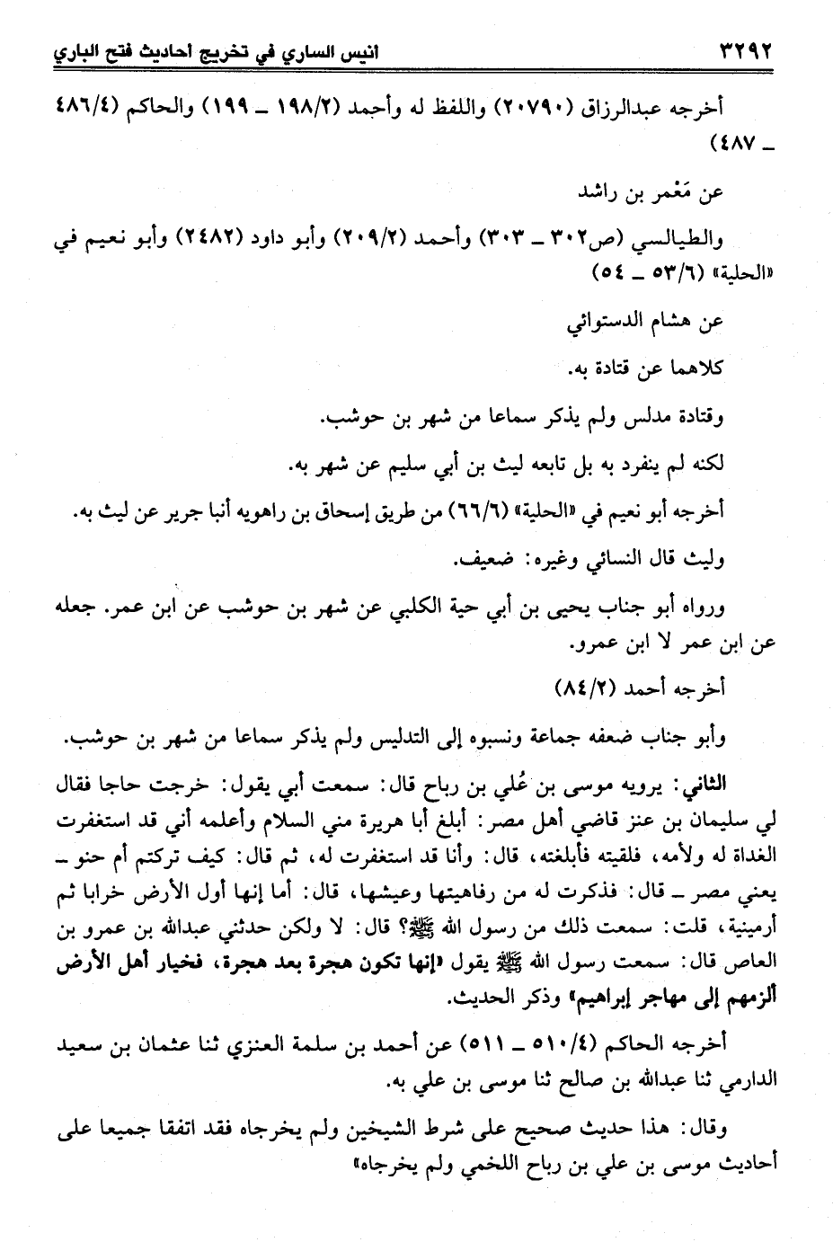 الثاني: يرويه موسى بن عُلي بن رباح قال: سمعت أبي يقول: خرجت حاجاً فقال لي سليمان بن عنز قاضي أهل مصر: أبلغ أبا هريرة مني السلام وأعلمه أني قد استغفرت الغداة له ولأمه، فلقيته فأبلغته، قال: وأنا قد استغفرت له، ثم قال: كيف تركتم أم حنو- يعني مصر- قال: فذكرت له من رفاهيتها وعيشها، قال: أما إنها أول الأرض خراباً ثم أرمينية، قلت: سمعت ذلك من رسول الله - صلى الله عليه وسلم -؟ قال: لا ولكن حدثني عبد الله بن عمرو بن العاص قال: سمعت رسول الله - صلى الله عليه وسلم - يقول "إنها تكون هجرة بعد هجرة، فخيار أهل الأرض ألزمهم إلى مهاجر إبراهيم" وذكر الحديث.