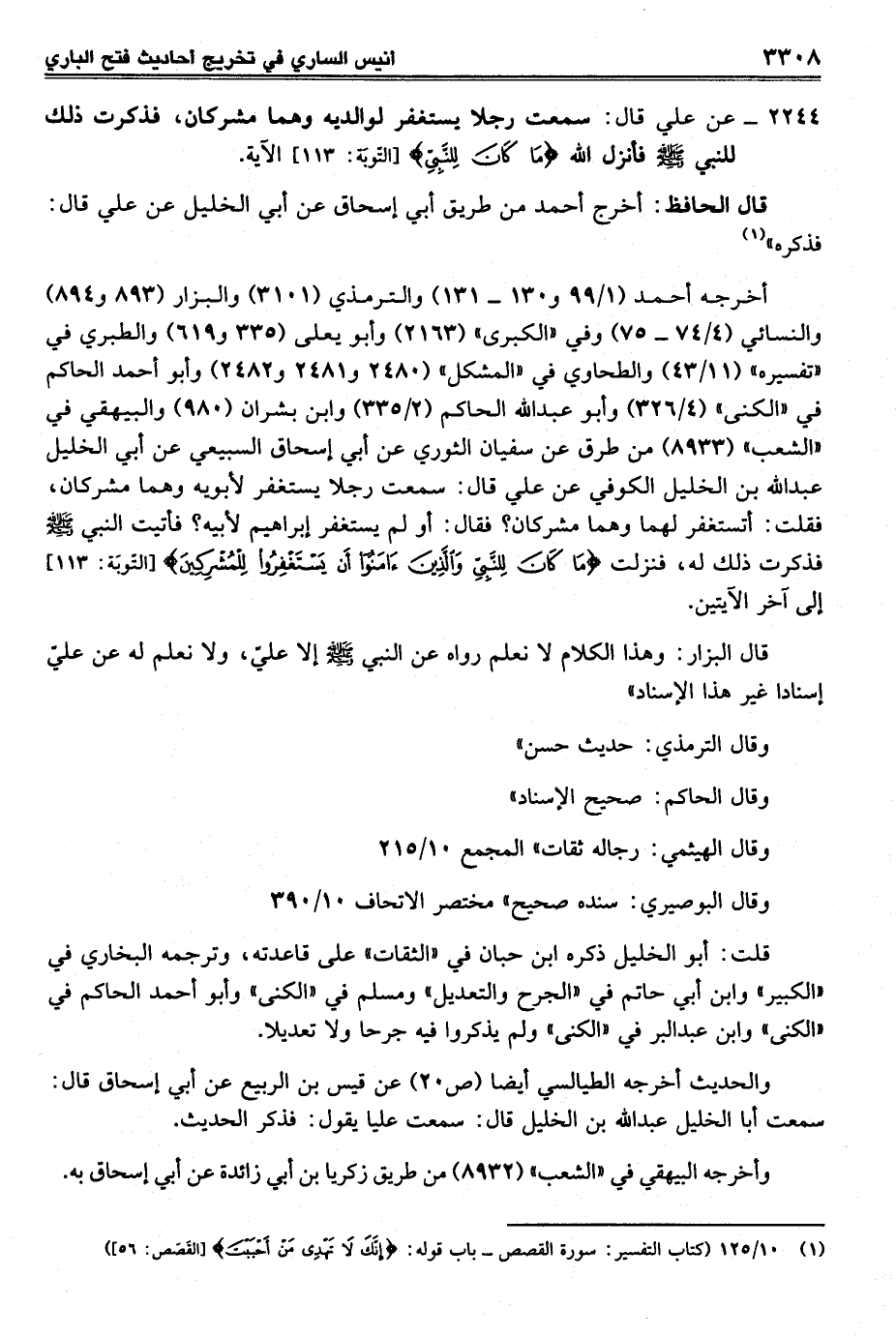 أخرجه أحمد (1/ 99 و 130 - 131) والترمذي (3101) والبزار (893 و 894) والنسائي (4/ 74 - 75) وفي "الكبرى" (2163) وأبو يعلى (335 و 619) والطبري في "تفسيره" (11/ 43) والطحاوي في "المشكل" (2480 و 2481 و 2482) وأبو أحمد الحاكم في "الكنى" (4/ 326) وأبو عبد الله الحاكم (2/ 335) وابن بشران (980) والبيهقي في "الشعب" (8933) من طرق عن سفيان الثوري عن أبي إسحاق السبيعي عن أبي الخليل عبد الله بن الخليل الكوفي عن علي قال: سمعت رجلاً يستغفر لأبويه وهما مشركان، فقلت: أتستغفر لهما وهما مشركان؟ فقال: أو لم يستغفر إبراهيم لأبيه؟ فأتيت النبي - صلى الله عليه وسلم - فذكرت ذلك له، فنزلت {مَا كَانَ لِلنَّبِيِّ وَالَّذِينَ آمَنُوا أَنْ يَسْتَغْفِرُوا لِلْمُشْرِكِينَ} [التوبة: 113] إلى آخر الآيتين.