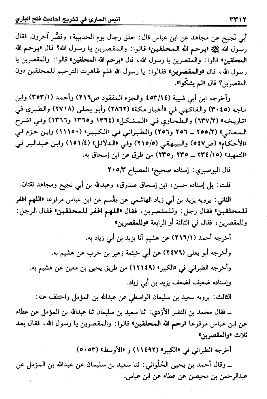- فقال محمد بن النضر الأزدي: ثنا سعيد بن سليمان ثنا عبد الله بن المؤمل عن عطاء عن ابن عباس مرفوعاً "رحم اله المحلقين" قالوا: والمقصرين يا رسول الله، فقال بعد ثلاث "والمقصرين"