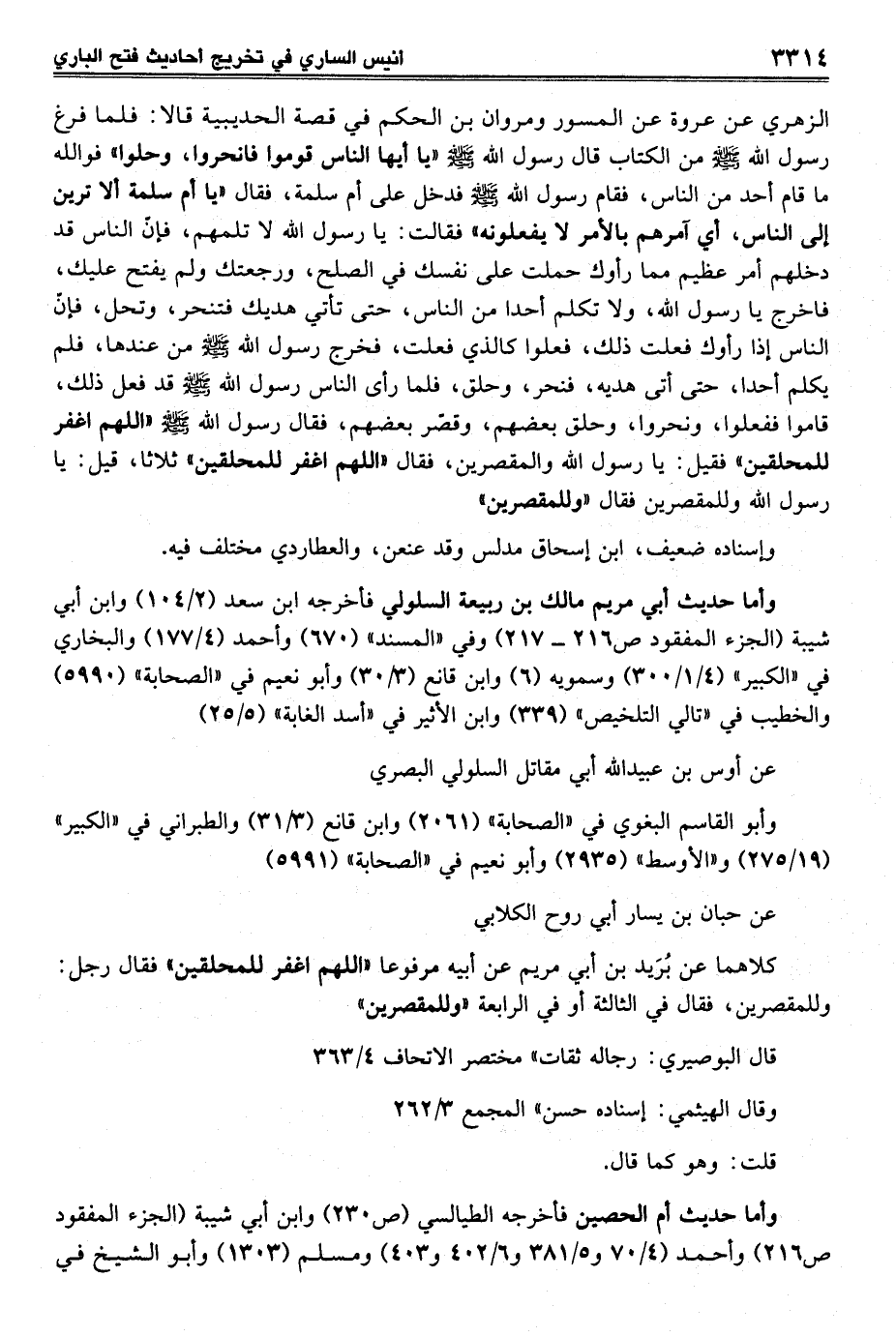 كلاهما عن بُرَيد بن أبي مريم عن أبيه مرفوعاً "اللهم اغفر للمحلقين" فقال رجل: وللمقصرين، فقال في الثالثة أو في الرابعة "وللمقصرين"