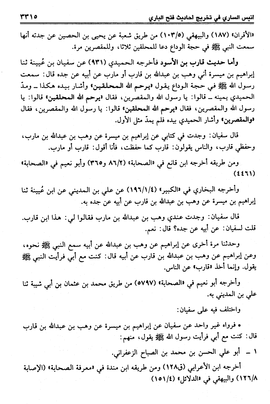 وأما حديث قارب بن الأسود فأخرجه الحميدي (931) عن سفيان بن عُيينة ثنا إبراهيم بن ميسرة أني وهب بن عبد الله بن قارب أو مارب عن أبيه عن جده قال: سمعت رسول الله - صلى الله عليه وسلم - في حجة الوداع يقول "يرحم الله المحلقين" وأشار بيده هكذا- ومدّ الحميدي يمينه- قالوا: يا رسول الله والمقصرين، فقال "يرحم الله المحلقين" قالوا: يا رسول الله والمقصرين، فقال "يرحم الله المحلقين" قالوا: يا رسول الله والمقصرين، فقال "والمقصرين" وأشار الحميدي بيده فلم يمدّ مثل الأول.