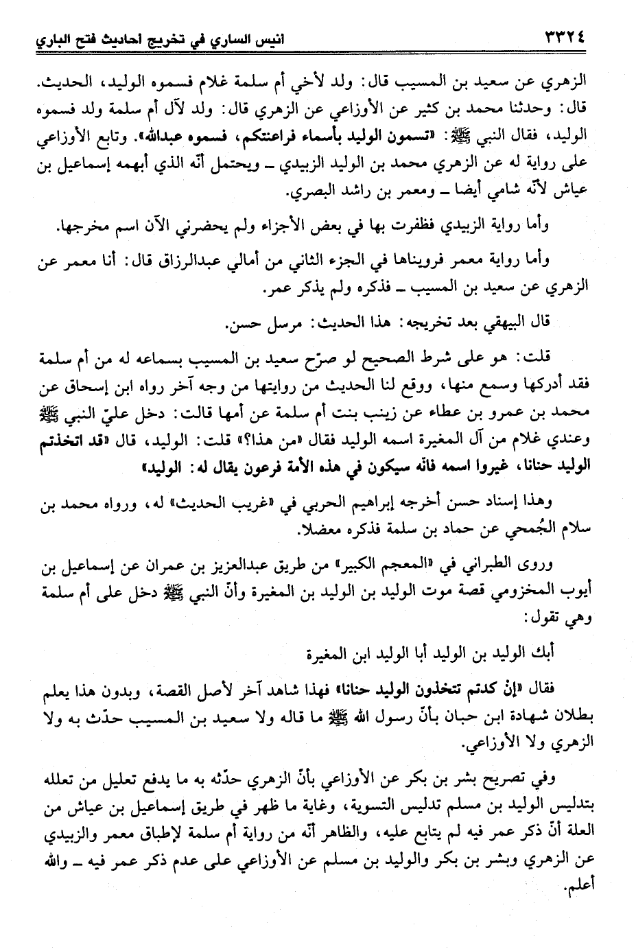 الزهري عن سعيد بن المسيب قال: ولد لأخي أم سلمة غلام فسموه الوليد، الحديث. قال: وحدثنا محمد بن كثير عن الأوزاعي عن الزهري قال: ولد لآل أم سلمة ولد فسموه الوليد، فقال النبي - صلى الله عليه وسلم -: "تسمون الوليد بأسماء فراعنتكم، فسموه عبد الله". وتابع الأوزاعي على رواية له عن الزهري محمد بن الوليد الزبيدي- ويحتمل أنّه الذي أبهمه إسماعيل بن عياش لأنّه شامي أيضاً- ومعمر بن راشد البصري.
