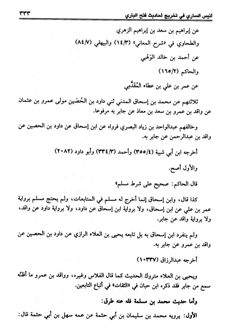 كذا قال، وابن إسحاق إنما أخرج له مسلم في المتابعات، ولم يحتج مسلم برواية عمر بن علي عن ابن إسحاق، ولا برواية ابن إسحاق عن داود، ولا برواية داود عن واقد، ولا برواية واقد عن جابر.