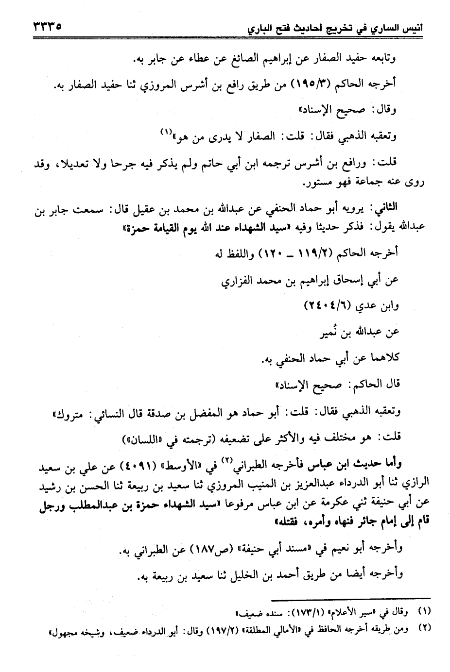 الثاني: يرويه أبو حماد الحنفي عن عبد الله بن محمد بن عقيل قال: سمعت جابر بن عبد الله يقول: فذكر حديثا وفيه "سيد الشهداء عند الله يوم القيامة حمزة"