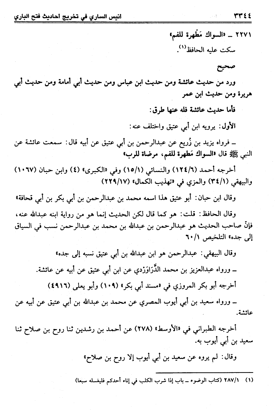- فرواه يزيد بن زُريع عن عبد الرحمن بن أبي عتيق عن أبيه قال: سمعت عائشة عن النبي - صلى الله عليه وسلم - قال "السواك مَطهرة للفم، مرضاة للرب"