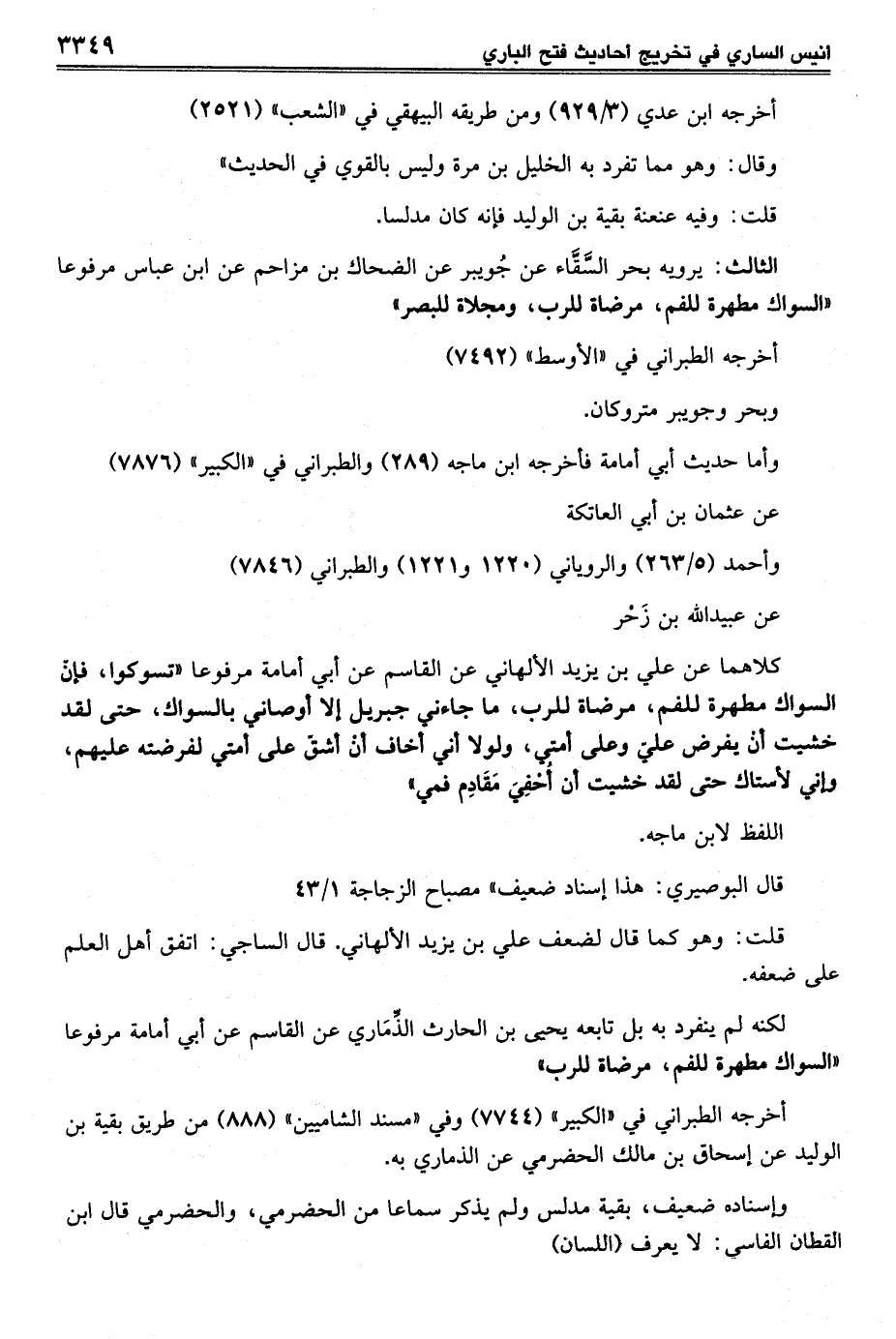 كلاهما عن علي بن يزيد الألهاني عن القاسم عن أبي أمامة مرفوعاً "تسوكوا، فإنّ السواك مطهرة للفم، مرضاة للرب، ما جاءني جبريل إلا أوصاني بالسواك، حتى لقد خشيت أنْ يفرض عليّ وعلى أمتي، ولولا أني أخاف أنْ أشقّ على أمتي لفرضته عليهم، وأني لأستاك حتى لقد خشيت أن أُخْفِيَ مَقَادِم فمي"