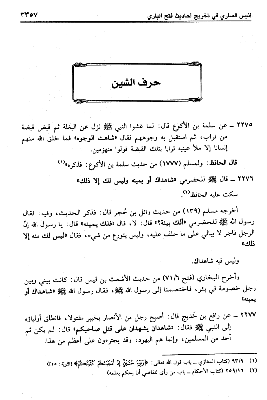 وأخرج البخاري (فتح 6/ 71) من حديث الأشعث بن قيس قال: كانت بيني وبين رجل خصومة في بئر، فاختصمنا إلى رسول الله - صلى الله عليه وسلم -، فقال رسول الله - صلى الله عليه وسلم - "شاهداك أو يمينه"