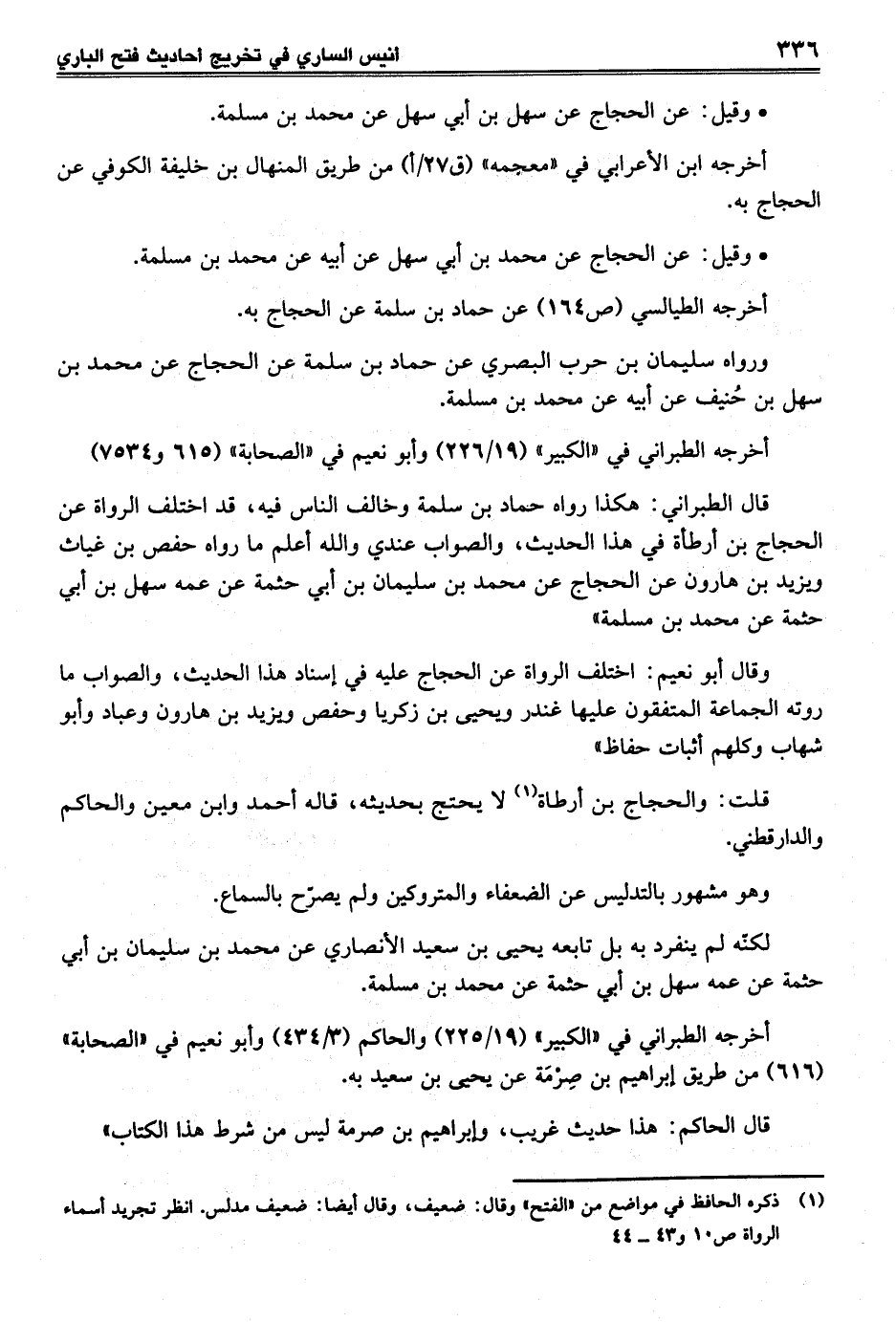 قال الطبراني: هكذا رواه حماد بن سلمة وخالف الناس فيه، قد اختلف الرواة عن الحجاج بن أرطأة في هذا الحديث، والصواب عندي والله أعلم ما رواه حفص بن غياث ويزيد بن هارون عن الحجاج عن محمَّد بن سليمان بن أبي حثمة عن عمه سهل بن أبي حثمة عن محمد بن مسلمة"
