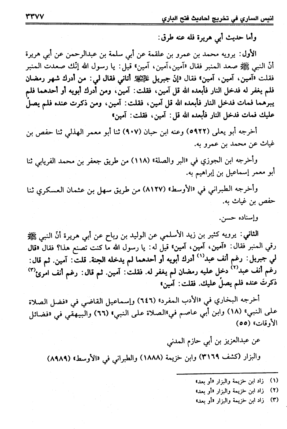 الأول: يرويه محمد بن عمرو بن علقمة عن أبي سلمة بن عبد الرحمن عن أبي هريرة أنّ النبي - صلى الله عليه وسلم - صعد المنبر فقال "آمين، آمين، آمين" قيل: يا رسول الله إنّك صعدت المنبر فقلت "آمين، آمين، آمين" فقال إن جبريل -عليه السلام- أتاني فقال لي: من أدرك شهر رمضان فلم يغفر له فدخل النار فأبعده الله قل آمين، فقلت: آمين، ومن أدرك أبويه أو أحدهما فلم يبرهما فمات فدخل النار فأبعده الله قل آمين، فقلت: آمين، ومن ذكرت عنده فلم يصلِّ عليك فمات فدخل النار فأبعده الله قل: آمين، فقلت: آمين"
