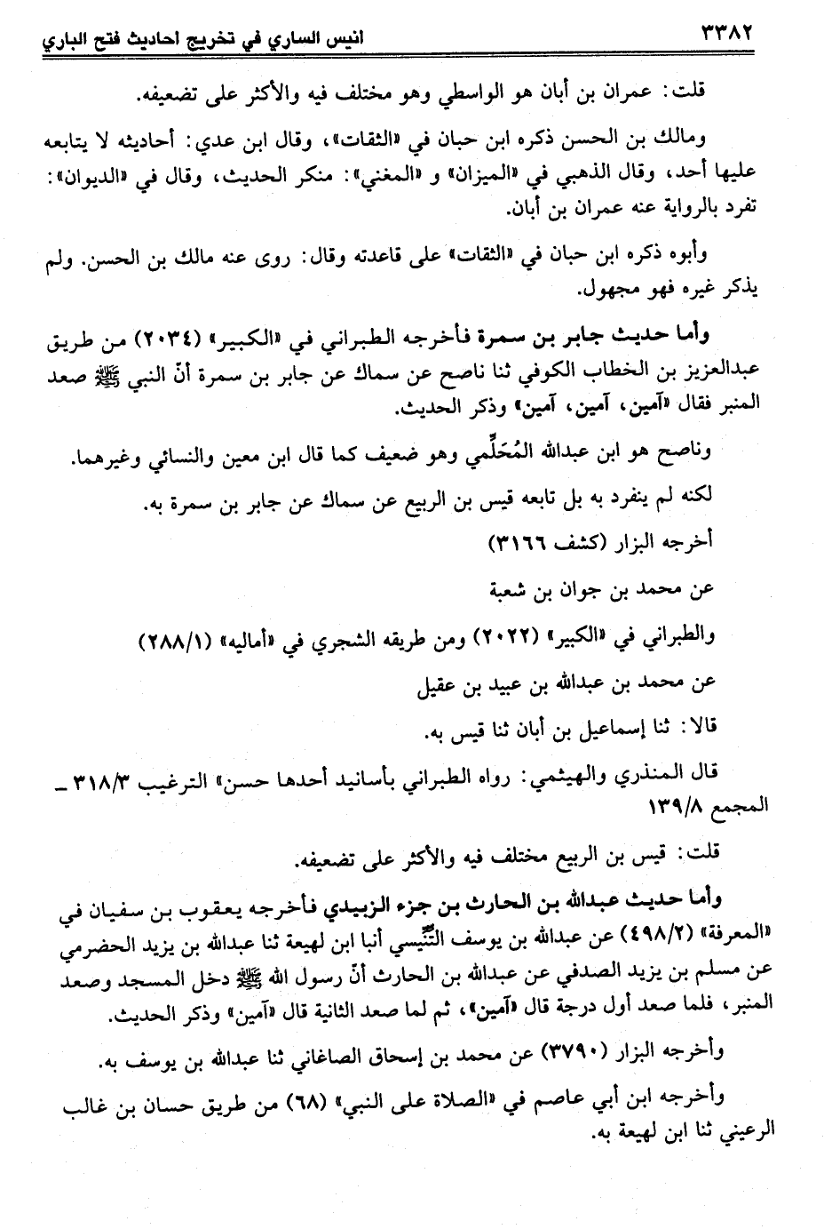 وأما حديث جابر بن سمرة فأخرجه الطبراني في "الكبير" (2034) من طريق عبد العزيز بن الخطاب الكوفي ثنا ناصح عن سماك عن جابر بن سمرة أنّ النبي - صلى الله عليه وسلم - صعد المنبر فقال "آمين، آمين، آمين" وذكر الحديث.