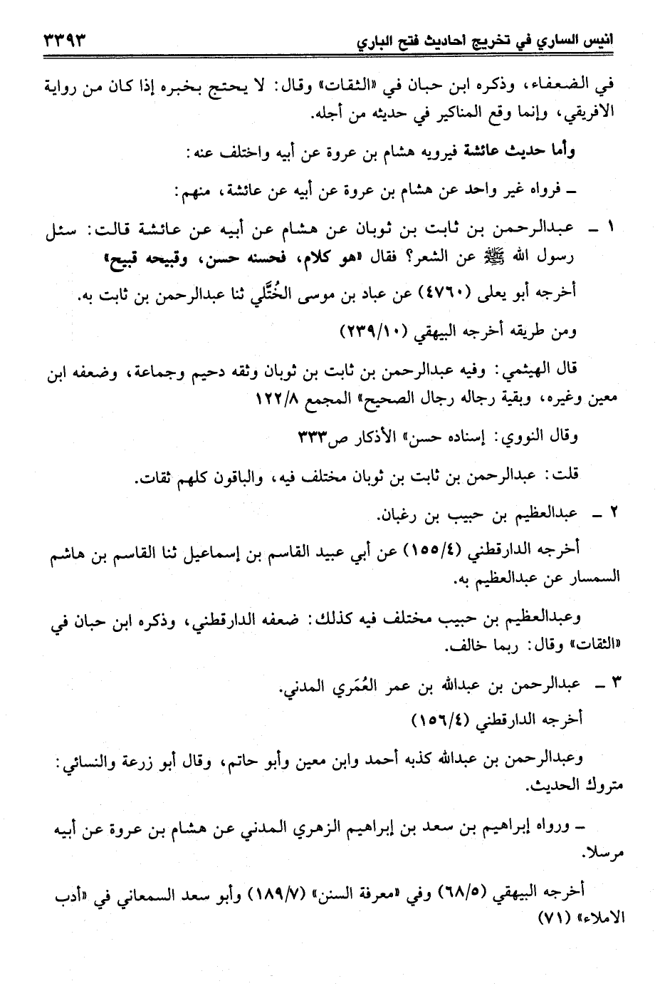 1 - عبد الرحمن بن ثابت بن ثوبان عن هشام عن أبيه عن عائشة قالت: سئل رسول الله - صلى الله عليه وسلم - عن الشعر؟ فقال "هو كلام، فحسنه حسن، وقبيحه قبح"
