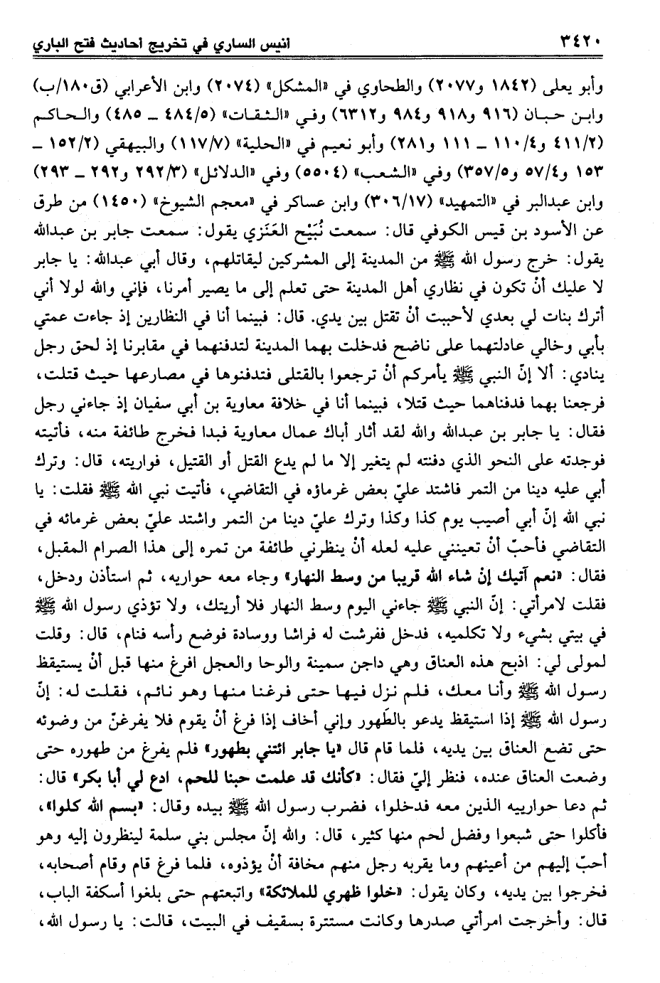 وأبو يعلى (1842 و 2077) والطحاوي في المشكل (2074) وابن الأعرابي (ق 180/ ب) وابن حبان (916 و 918 و 984 و 6312) وفي "الثقات" (5/ 484 - 485) والحاكم (2/ 411 و 4/ 110 - 111 و 281) وأبو نعيم في "الحلية" (7/ 117) والبيهقي (2/ 152 - 153 و 4/ 57 و5/ 357) وفي "الشعب" (5504) وفي "الدلائل" (3/ 292 و 292 - 293) وابن عبد البر في "التمهيد" (17/ 306) وابن عساكر في "معجم الشيوخ" (1450) من طرق عن الأسود بن قيس الكوفي قال: سمعت نُبَيْح العَنَزي يقول: سمعت جابر بن عبد الله يقول: خرج رسول الله - صلى الله عليه وسلم - من المدينة إلى المشركين ليقاتلهم، وقال أبي عبد الله: يا جابر لا عليك أنْ تكون في نظاري أهل المدينة حتى تعلم إلى ما يصير أمرنا، فإني والله لولا أني أترك بنات لي بعدي لأحببت أنْ تقتل بين يدي. قال: فبينما أنا في النظارين إذ جاءت عمتي بأبي وخالي عادلتهما على ناضح فدخلت بهما المدينة لتدفنهما في مقابرنا إذ لحق رجل ينادي: ألا إنّ النبي - صلى الله عليه وسلم - يأمركم أنْ ترجعوا بالقتلى فتدفنوها في مصارعها حيث قتلت، فرجعنا بهما فدفناهما حيث قتلا، فبينما أنا في خلافة معاوية بن أبي سفيان إذ جاءني رجل فقال: يا جابر بن عبد الله والله لقد أثار أباك عمال معاوية فبدا فخرج طائفة منه، فأتيته فوجدته على النحو الذي دفنته لم يتغير إلا ما لم يدع القتل أو القتيل، فواريته، قال: وترك أبي عليه دينا من التمر فاشتد عليّ بعض غرماؤه في التقاضي، فأتيت نبي الله - صلى الله عليه وسلم - فقلت: يا نبي الله إنّ أبي أصيب يوم كذا وكذا وترك عليّ ديناً من التمر واشتد عليّ بعض غرمائه في التقاضي فأحبّ أنْ تعينني عليه لعله أنْ ينظرني طائفة من تمره إلى هذا الصرام المقبل، فقال: "نعم آتيك إنْ شاء الله قريباً من وسط النهار" وجاء معه حواريه، ثم استأذن ودخل، فقلت لامرأتي: إنّ النبي - صلى الله عليه وسلم - جاءني اليوم وسط النهار فلا أريتك، ولا تؤذي رسول الله - صلى الله عليه وسلم - في بيتي بشيء ولا تكلميه، فدخل ففرشت له فراشاً ووسادة فوضع رأسه فنام، قال: وقلت لمولى لي: اذبح هذه العناق وهي داجن سمينة والوحا والعجل افرغ منها قبل أنْ يستيقظ رسول الله - صلى الله عليه وسلم - وأنا معك، فلم نزل فيها حتى فرغنا منها وهو نائم، فقلت له: إنّ رسول الله - صلى الله عليه وسلم - إذا استيقظ يدعو بالطَهور وإني أخاف إذا فرغ أنْ يقوم فلا يفرغنّ من وضوئه حتى تضع العناق بين يديه، فلما قام قال "يا جابر ائتني بطهور" فلم يفرغ من طهوره حتى وضعت العناق عنده، فنظر إليّ فقال: "كأنك قد علمت حبنا للحم، ادع لي أبا بكر" قال: ثم دعا حوارييه الذين معه فدخلوا، فضرب رسول الله - صلى الله عليه وسلم - بيده وقال: "بسم الله كلوا"، فأكلوا حتى شبعوا وفضل لحم منها كثير، قال: والله إن مجلس بني سلمة لينظرون إليه وهو أحب إليهم من أعينهم وما يقربه رجل منهم مخافة أنْ يؤذوه، فلما فرغ قام وقام أصحابه، فخرجوا بين يديه، وكان يقول: "خلوا ظهري للملائكة" واتبعتهم حتى بلغوا أسكفة الباب، قال: وأخرجت امرأتي صدرها وكانت مستترة بسقيف في البيت، قالت: يا رسول الله،