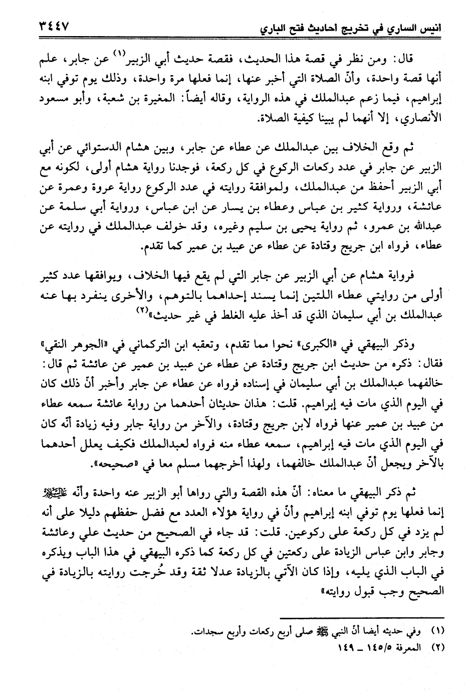ثم ذكر البيهقي ما معناه: أنّ هذه القصة والتي رواها أبو الزبير عنه واحدة وأنّه -عليه السلام- إنما فعلها يوم توفي ابنه إبراهيم وأنّ في رواية هؤلاء العدد مع فضل حفظهم دليلاً على أنه لم يزد في كل ركعة على ركوعين. قلت: قد جاء في الصحيح من حديث علي وعائشة وجابر وابن عباس الزيادة على ركعتين في كل ركعة كما ذكره البيهقي في هذا الباب ويذكره في الباب الذي يليه، وإذا كان الآتي بالزيادة عدلاً ثقة وقد خُرجت روايته بالزيادة في الصحيح وجب قبول روايته"