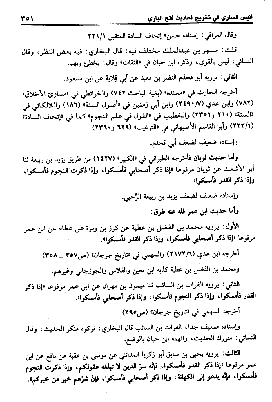 الثالث: يرويه يحيى بن سابق أبو زكريا المدائني عن موسى بن عقبة عن نافع عن ابن عمر مرفوعا "إذا ذكر القدر فأمسكوا، فإنَّه سرّ الدين لا تبلغه عقولكم، وإذا ذكرت النجوم فأمسكوا، فإنّه يدعو إلى الكهانة، وإذا ذكر أصحابي فأمسكوا، فإنّ شرّهم خير من خيركم".