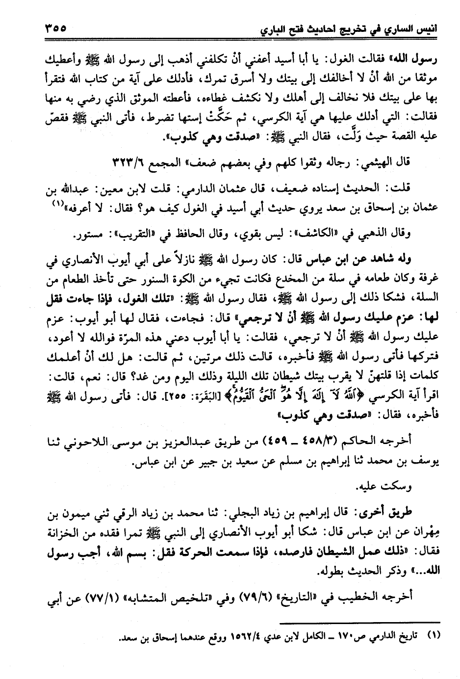 قلت: الحديث إسناده ضعيف، قال عثمان الدارمي: قلت لابن معين: عبد الله بن عثمان بن إسحاق بن سعد يروي حديث أبي أسيد في الغول كيف هو؟ فقال: لا أعرفه" (¬1)