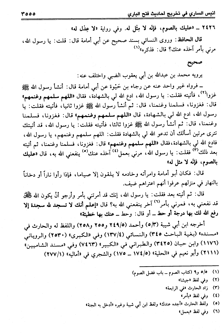 2426 - "عليك بالصوم، فإنّه لا مِثْل له. وفي رواية "لا عِدْل له"