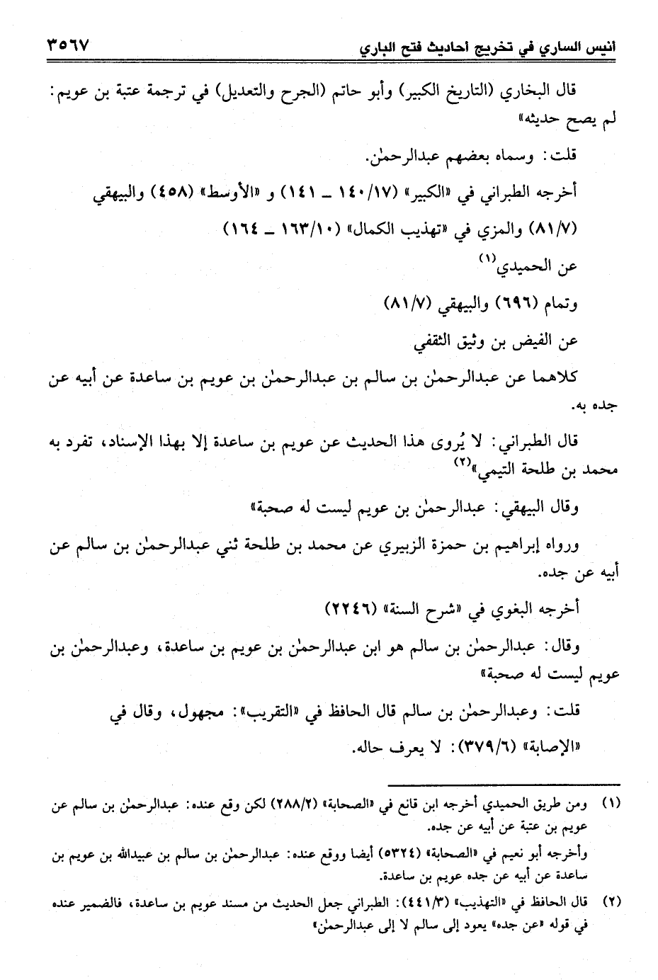 (¬2) قال الحافظ في "التهذيب" (3/ 441): الطبراني جعل الحديث من مسند عويم بن ساعدة، فالضمير عنده في قوله "عن جده" يعود إلى سالم لا إلى عبد الرحمن"