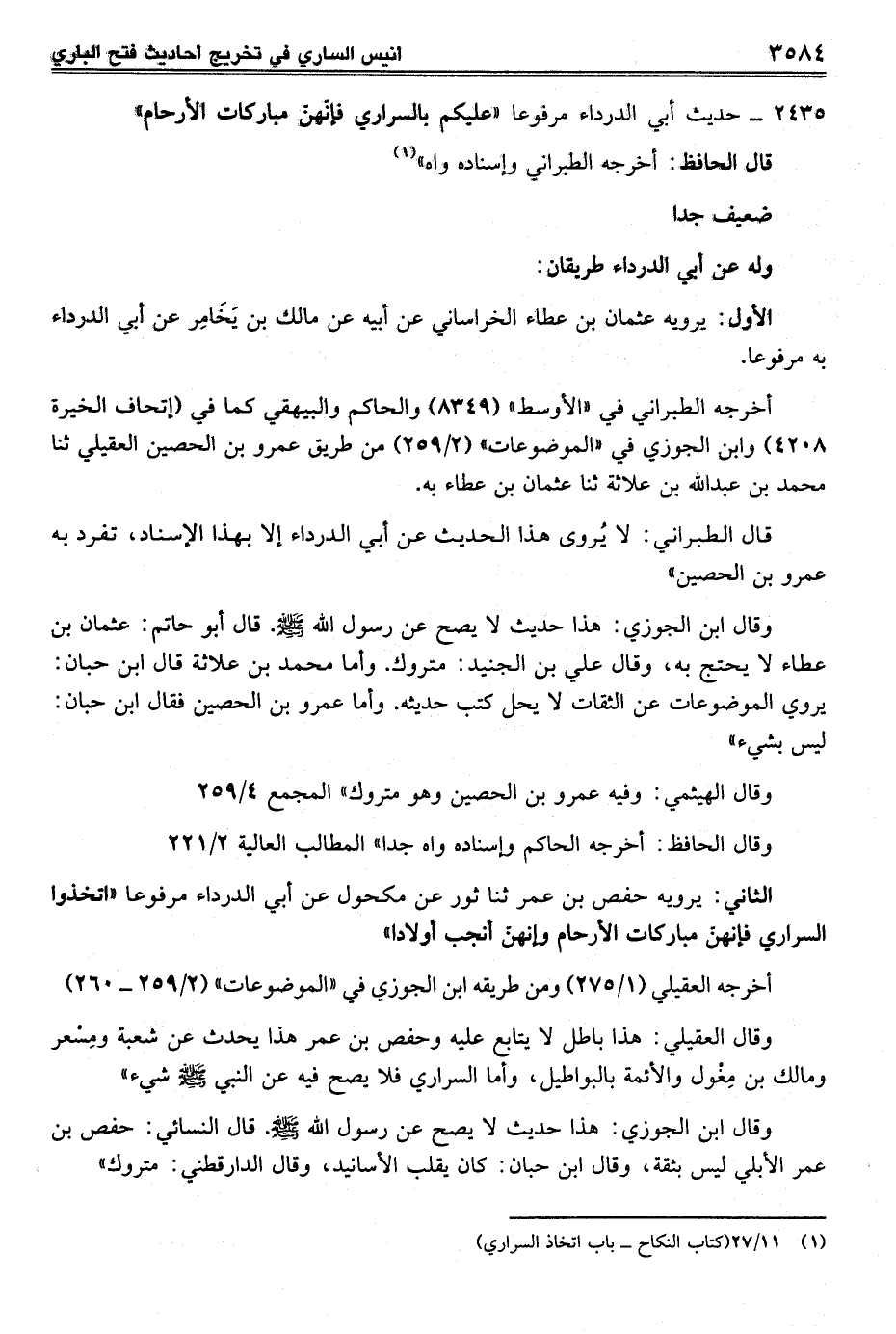 2435 - حديث أبي الدرداء مرفوعا "عليكم بالسراري فإنّهنّ مباركات الأرحام"