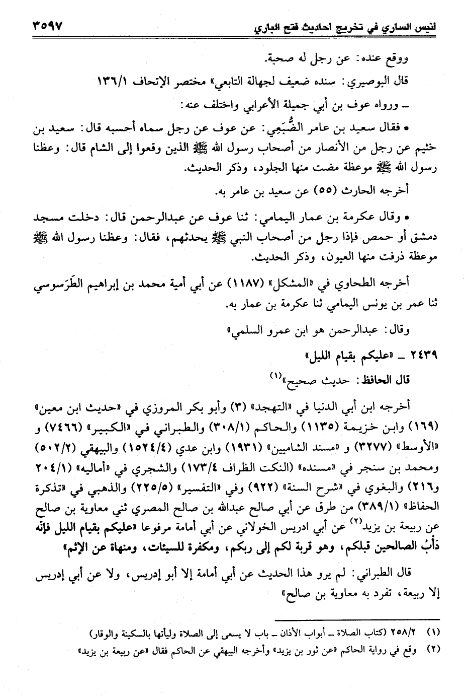 أخرجه ابن أبي الدنيا في "التهجد" (3) وأبو بكر المروزي في "حديث ابن معين" (169) وابن خزيمة (1135) والحاكم (1/ 308) والطبراني في "الكبير" (7466) و "الأوسط" (3277) و"مسند الشاميين" (1931) وابن عدي (4/ 1524) والبيهقي (2/ 502) ومحمد بن سنجر في "مسنده" (النكت الظراف 4/ 173) والشجري في "أماليه" (1/ 204 و 216) والبغوي في "شرح السنة" (922) وفي "التفسير" (5/ 225) والذهبي في "تذكرة الحفاظ" (1/ 389) من طرق عن أبي صالح عبد الله بن صالح المصري ثني معاوية بن صالح عن ربيعة بن يزيد (¬2) عن أبي إدريس الخولاني عن أبي أمامة مرفوعا "عليكم بقيام الليل فإنّه دَأْبُ الصالحين قبلكم، وهو قربة لكم إلى ربكم، ومكفرة للسيئات، ومنهاة عن الإثم"