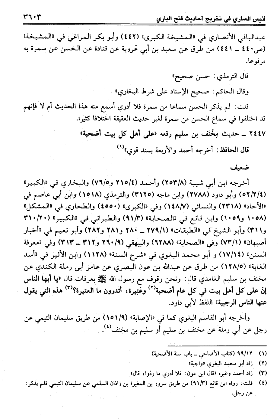 أخرجه ابن أبي شيبة (8/ 253) وأحمد (4/ 215 و5/ 76) والبخاري في "الكبير" (4/ 2/ 52) وأبو داود (2788) وابن ماجه (3125) والترمذي (1518) وابن أبي عاصم في "الآحاد" (2318) والنسائي (7/ 148) وفي "الكبرى" (4550) والطحاوي في "المشكل" (1058 و 1059) وابن قانع في "الصحابة" (3/ 91) والطبراني في "الكبير" (20/ 310 و311) وأبو الشيخ في "الطبقات" (1/ 279 - 280 و 281 و 282) وأبو نعيم في "أخبار أصبهان" (1/ 73) وفي "الصحابة" (6288) والبيهقي (9/ 260 و 312 - 313) وفي "معرفة السنن" (14/ 17) وأبو محمد البغوي في "شرح السنة" (1128) وابن الأثير في "أسد الغابة" (5/ 128) من طرق عن عبد الله بن عون البصري عن عامر أبى رملة الكندي عن مخنف بن سليم الغامدي قال: ونحن وقوف مع رسول الله - صلى الله عليه وسلم - بعرفات قال "يا أيها الناس إنّ على كل أهل بيت في كل عام أضحية (¬2) وعَتِيرة، أتدرون ما العتيرة؟ (¬3) هذه التي يقول عنها الناس الرجبية" اللفظ لأبي داود.
