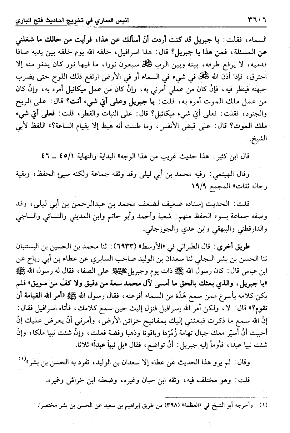 طريق أخرى: قال الطبراني في "الأوسط" (6933): ثنا محمد بن الحسين بن البستنبان ثنا الحسن بن بشر البجلي ثنا سعدان بن الوليد صاحب السابري عن عطاء بن أبي رباح عن ابن عباس قال: كان رسول الله - صلى الله عليه وسلم - ذات يوم وجبريل عليه السلام على الصفا، فقال له رسول الله - صلى الله عليه وسلم - "يا جبريل، والذي بعثك بالحق ما أمسى لآل محمد سعة من دقيق ولا كفّ من سويق" فلم يكن كلامه بأسرع ممن سمع هَدّة من السماء أفزعته، فقال رسول الله - صلى الله عليه وسلم - "أمر الله القيامة أن تقوم؟ " قال: لا، ولكن أمر الله إسرافيل فنزل إليك حين سمع كلامك، فأتاه إسرافيل فقال: إنّ الله سمع ما ذكرت فبعثني إليك بمفاتيح خزائن الأرض، وأمرني أنْ يعرض عليك إنْ أحببت أنْ أسيّر معك جبال تهامة زُمُرّدا وياقوتا وذهبا وفضة فعلت، وإنْ شئت نبيا ملكا، وإنْ شئت نبيا عبدا، فأومأ إليه جبريل: أنْ تواضع، فقال "بل نبيًا عبدًا" ثلاثًا.