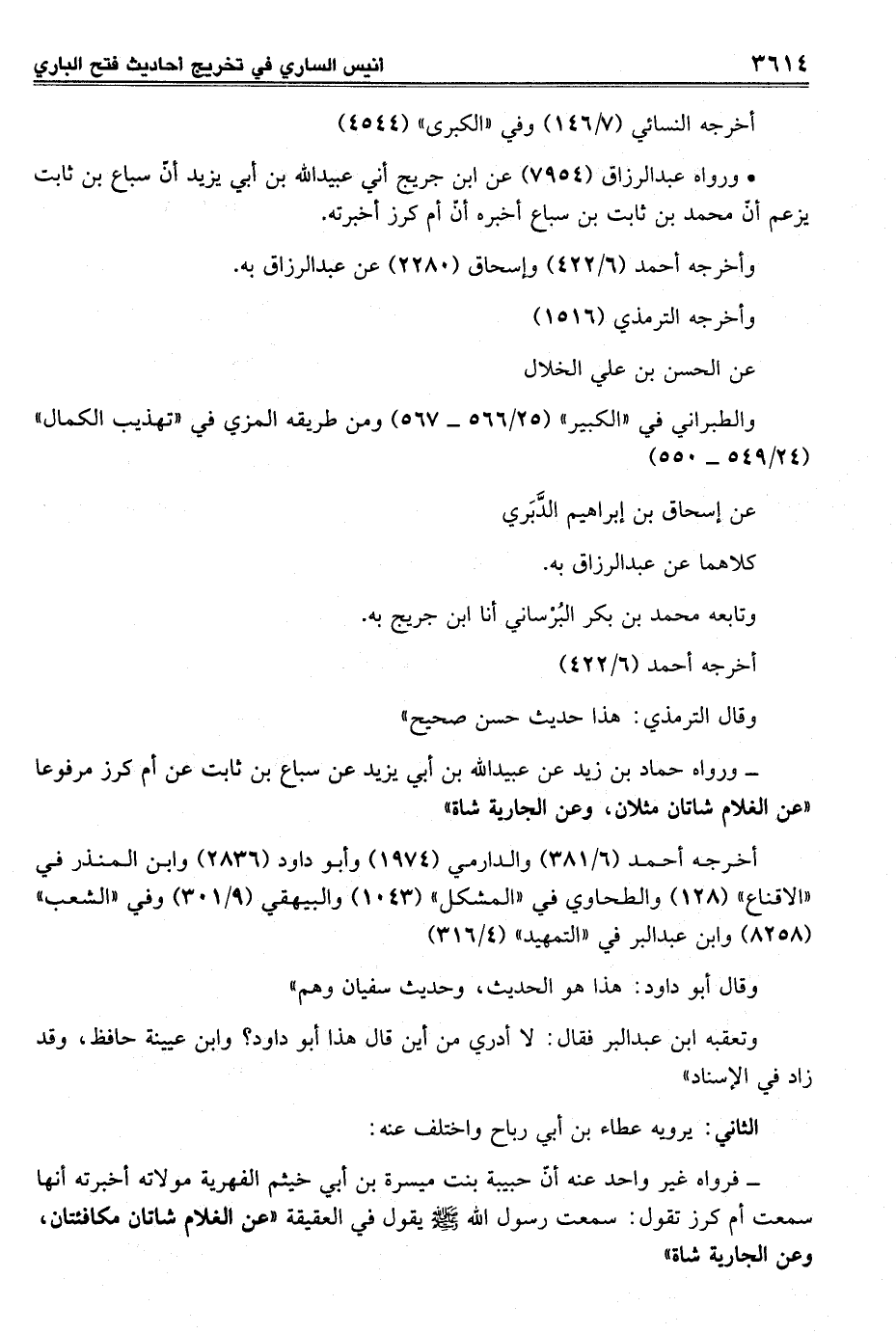 - ورواه حماد بن زيد عن عبيد الله بن أبي يزيد عن سباع بن ثابت عن أم كرز مرفوعا "عن الغلام شاتان مثلان، وعن الجارية شاة"