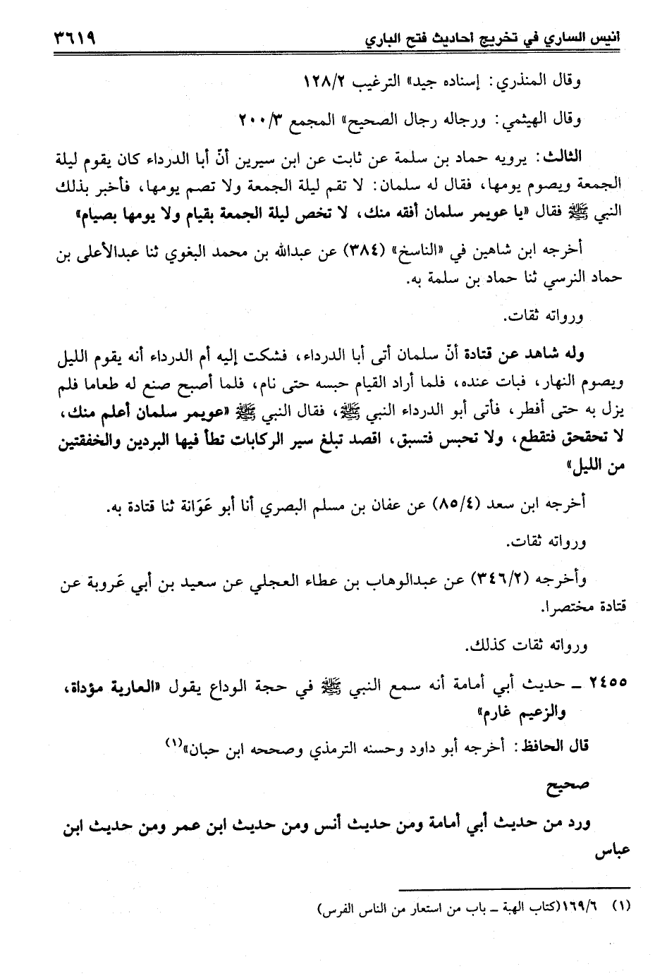 الثالث: يرويه حماد بن سلمة عن ثابت عن ابن سيرين أن أبا الدرداء كان يقوم ليلة الجمعة ويصوم يومها، فقال له سلمان: لا تقم ليلة الجمعة ولا تصم يومها، فأخبر بذلك النبي - صلى الله عليه وسلم - فقال "يا عويمر سلمان أفقه منك، لا تخص ليلة الجمعة بقيام ولا يومها بصيام"
