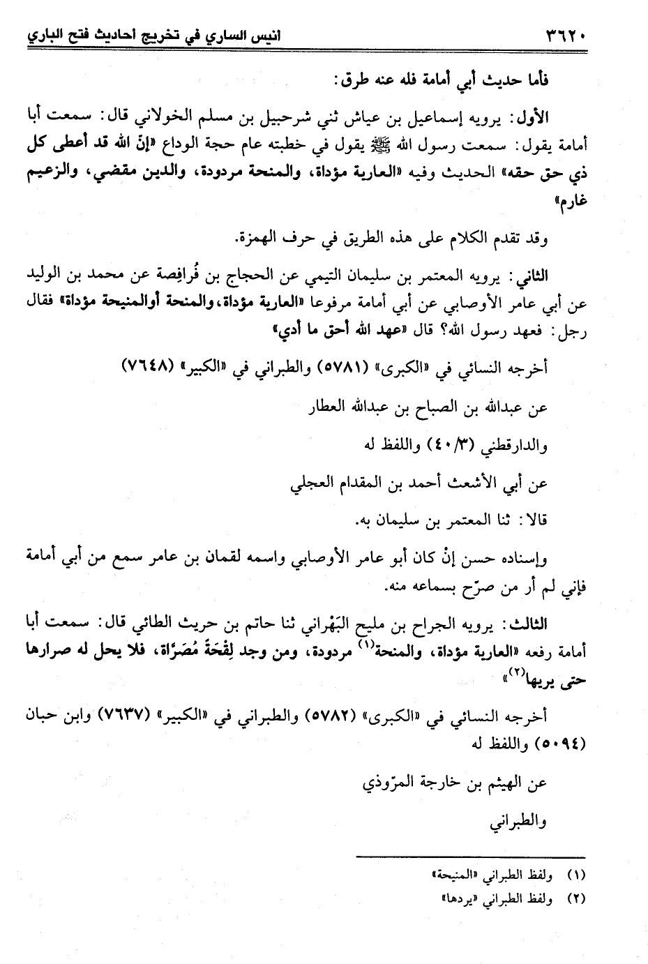 الثاني: يرويه المعتمر بن سليمان التيمي عن الحجاج بن فُرافِصة عن محمد بن الوليد عن أبي عامر الأوصابي عن أبي أمامة مرفوعا "العارية مؤداة، والمنحة أو المنيحة مؤداة" فقال رجل: فعهد رسول الله؟ قال "عهد الله أحق ما أدي"