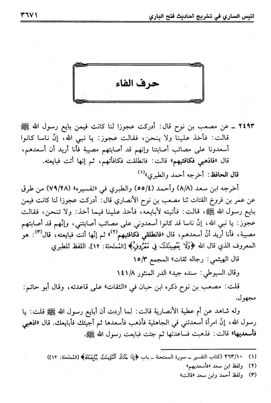 2493 - عن مصعب بن نوح قال: أدركت عجوزا لنا كانت فيمن بايع رسول الله - صلى الله عليه وسلم - قالت: فأخذ علينا ولا ينحن، فقالت عجوز: يا نبي الله، إنّ ناسا كانوا أسعدونا على مصائب أصابتنا وإنهم قد أصابتهم مصيبة فأنا أريد أن أسعدهم، قال "فاذهبي فكافئيهم" قالت: فانطلقت فكافأتهم، ثم إنها أتت فبايعته.