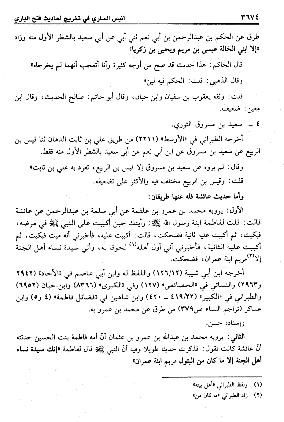 الثاني: يرويه محمد بن عبد الله بن عمرو بن عثمان أنّ أمه فاطمة بنت الحسين حدثته أنّ عائشة كانت تقول: فذكرت حديثا طويلًا وفيه أنّ النبي - صلى الله عليه وسلم - قال لفاطمة "إنك سيدة نساء أهل الجنة إلا ما كان من البتول مريم ابنة عمران"
