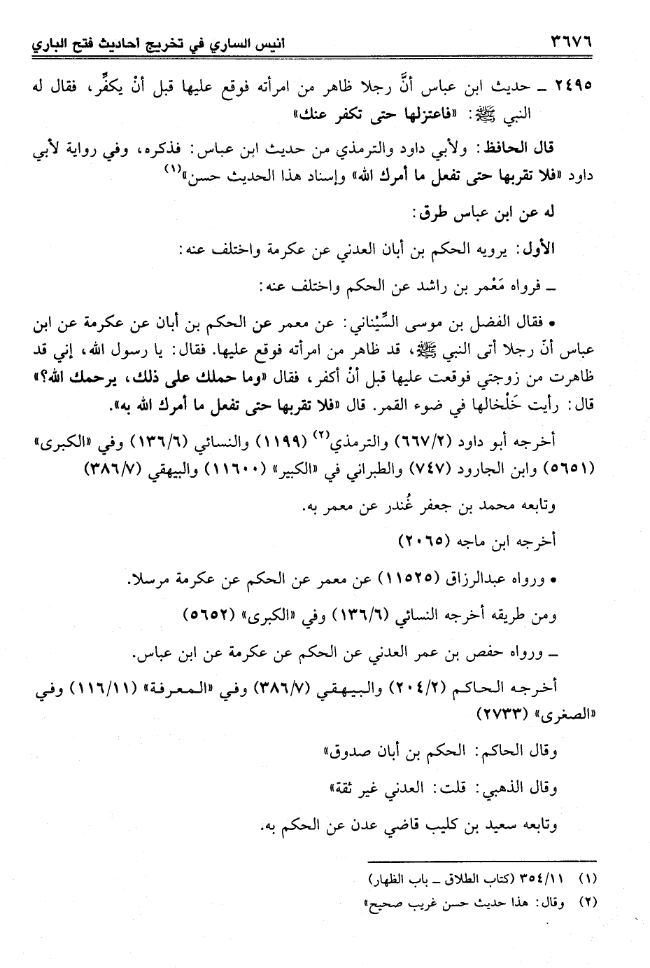 • فقال الفضل بن موسى السِّيْناني: عن معمر عن الحكم بن أبان عن عكرمة عن ابن عباس أنّ رجلًا أتى النبي - صلى الله عليه وسلم -، قد ظاهر من امرأته فوقع عليها. فقال: يا رسول الله، إني قد ظاهرت من زوجتي فوقعت عليها قبل أنْ أكفر، فقال "وما حملك على ذلك، يرحمك الله؟ " قال: رأيت خَلْخالها في ضوء القمر. قال "فلا تقربها حتى تفعل ما أمرك الله به".