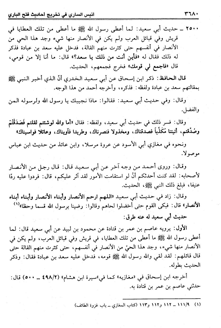 2500 - حديث أبي سعيد: لما أعطى رسول الله - صلى الله عليه وسلم - ما أعطى من تلك العطايا في قريش وفي قبائل العرب ولم يكن في الأنصار منها شيء وجد هذا الحي من الأنصار في أنفسهم حتى كثرت منهم المقالة، فدخل عليه سعد بن عبادة فذكر له ذلك فقال له "فأين أنت من ذلك يا سعد؟ " قال: ما أنا إلا من قومي، قال "فاجمع لي قومك" فخرج فجمعهم، الحديث.