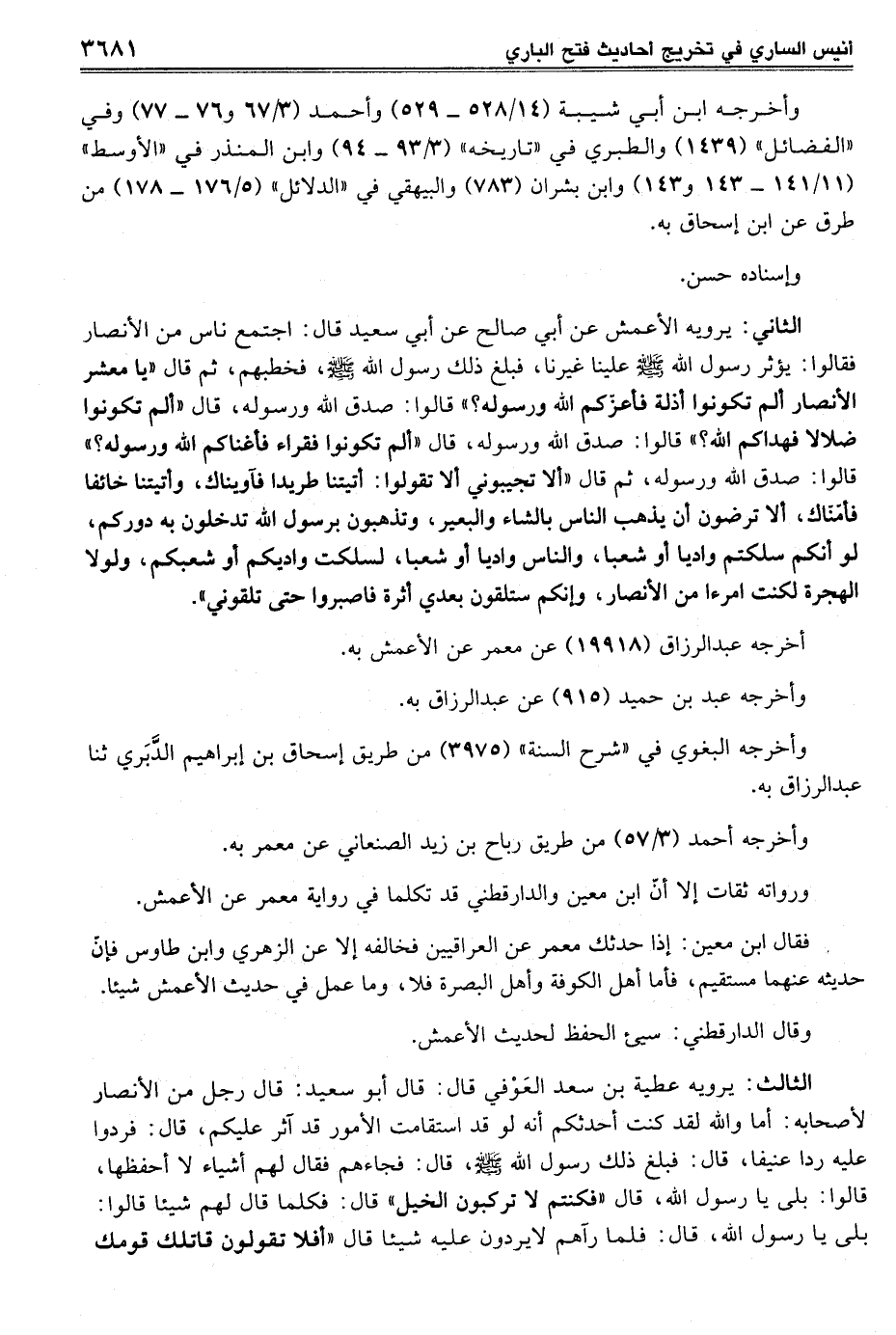 الثاني: يرويه الأعمش عن أبي صالح عن أبي سعيد قال: اجتمع ناس من الأنصار فقالوا: يؤثر رسول الله - صلى الله عليه وسلم - علينا غيرنا، فبلغ ذلك رسول الله - صلى الله عليه وسلم -، فخطبهم، ثم قال "يا معشر الأنصار ألم تكونوا أذلة فأعزّكم الله ورسوله؟ " قالوا: صدق الله ورسوله، قال "ألم تكونوا ضلالا فهداكم الله؟ " قالوا: صدق الله ورسوله، قال "ألم تكونوا فقراء فأغناكم الله ورسوله؟ " قالوا: صدق الله ورسوله، ثم قال "ألا تجيبوني ألا تقولوا: أتيتنا طريدا فآويناك، وأتيتنا خائفا فأمّنّاك، ألا ترضون أن يذهب الناس بالشاء والبعير، وتذهبون برسول الله تدخلون به دوركم، لو أنكم سلكتم واديًا أو شعبا، والناس واديًا أو شعبا، لسلكت واديكم أو شعبكم، ولولا الهجرة لكنت امرءا من الأنصار، وإنكم ستلقون بعدي أثرة فاصبروا حتى تلقوني".
