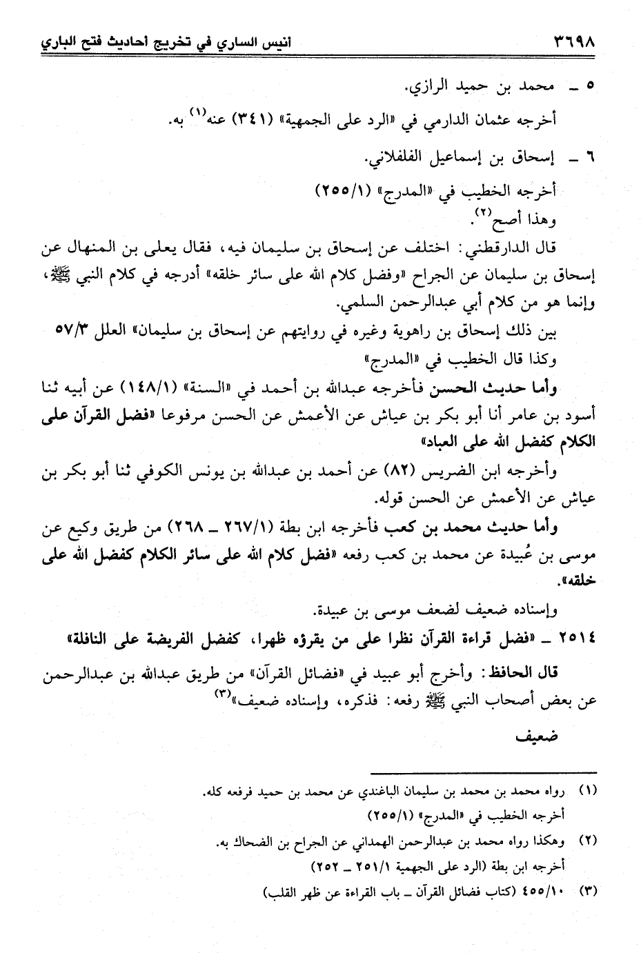 قال الدارقطني: اختلف عن إسحاق بن سليمان فيه، فقال يعلى بن المنهال عن إسحاق بن سليمان عن الجراح "وفضل كلام الله على سائر خلقه" أدرجه في كلام النبي - صلى الله عليه وسلم -، وإنما هو من كلام أبي عبد الرحمن السلمي.