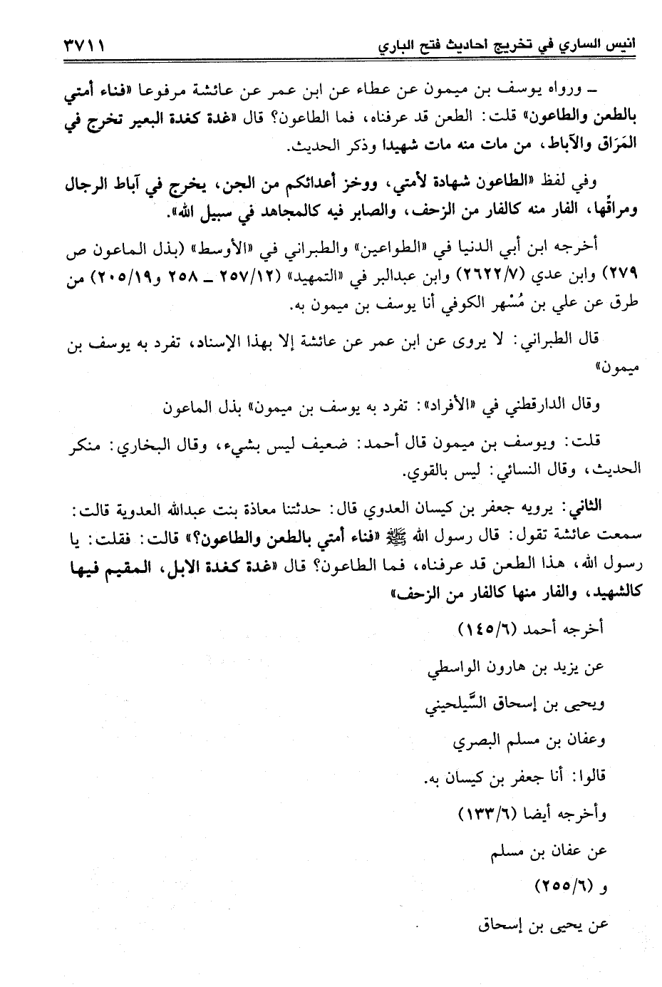 - ورواه يوسف بن ميمون عن عطاء عن ابن عمر عن عائشة مرفوعاً "فناء أمتي بالطعن والطاعون" قلت: الطعن قد عرفناه، فما الطاعون؟ قال "غدة كغدة البعير تخرج في المَرَاق والآباط، من مات منه مات شهيدا وذكر الحديث.