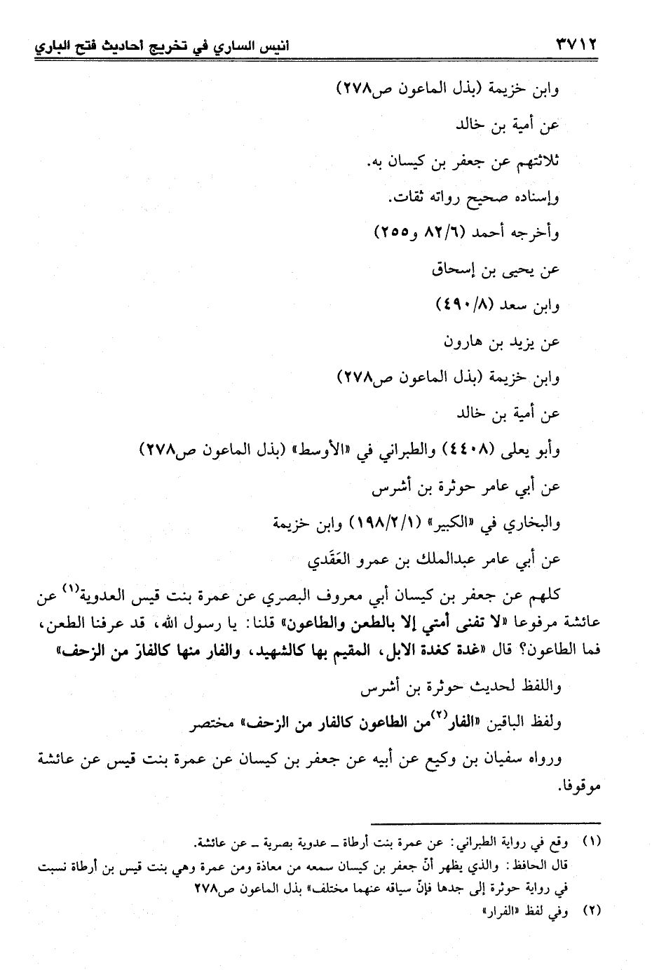 كلهم عن جعفر بن كيسان أبي معروف البصري عن عمرة بنت قيس العدوية (¬1) عن عائشة مرفوعا "لا تفنى أمتي إلا بالطعن والطاعون" قلنا: يا رسول الله، قد عرفنا الطعن، فما الطاعون؟ قال "غدة كغدة الإبل، المقيم بها كالشهيد، والفار منها كالفارّ من الزحف"