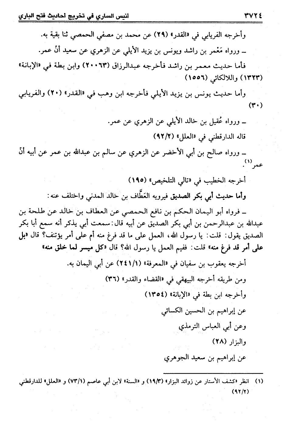 - فرواه أبو اليمان الحكم بن نافع الحمصي عن العطاف بن خالد عن طلحة بن عبد الله بن عبد الرحمن بن أبي بكر الصديق عن أبيه قال: سمعت أبي يذكر أنه سمع أبا بكر الصديق يقول: قلت: يا رسول الله، العمل على ما قد فرغ منه أم على أمر يؤتنف؟ قال "بل على أمر قد فرغ منه" قلت: ففيم العمل يا رسول الله؟ قال "كل ميسر لما خلق منه"