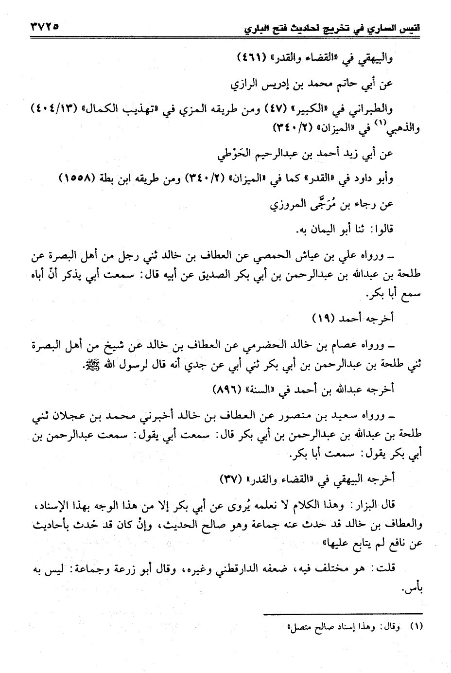 - ورواه علي بن عياش الحمصي عن العطاف بن خالد ثني رجل من أهل البصرة عن طلحة بن عبد الله بن عبد الرحمن بن أبي بكر الصديق عن أبيه قال: سمعت أبي يذكر أنّ أباه سمع أبا بكر.