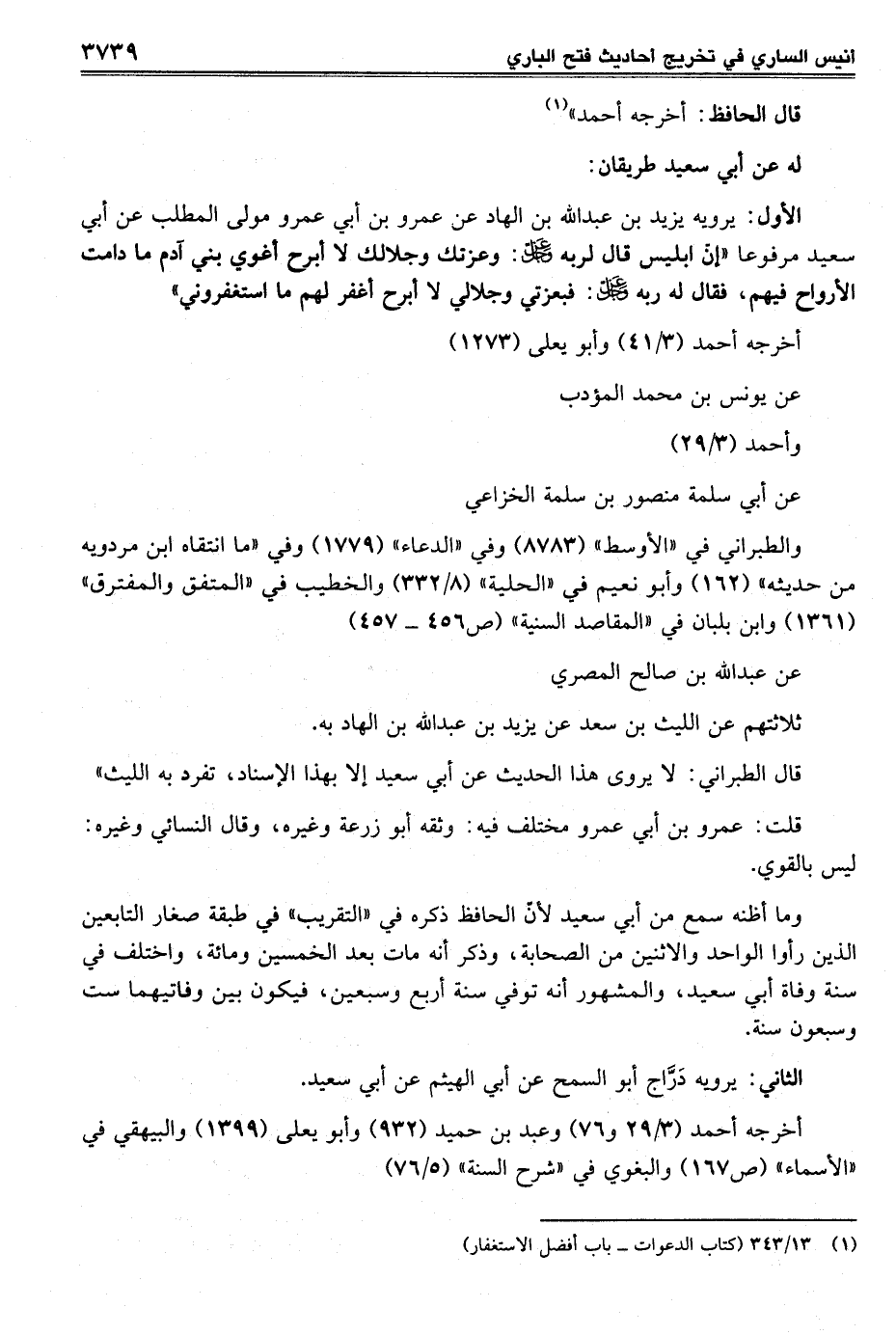 الأول: يرويه يزيد بن عبد الله بن الهاد عن عمرو بن أبي عمرو مولى المطلب عن أبي سعيد مرفوعاً "إنّ إبليس قال لربه عز وجل: وعزتك وجلالك لا أبرح أغوي بني آدم ما دامت الأرواح فيهم، فقال له ربه عز وجل: فبعزتي وجلالي لا أبرح أغفر لهم ما استغفروني"