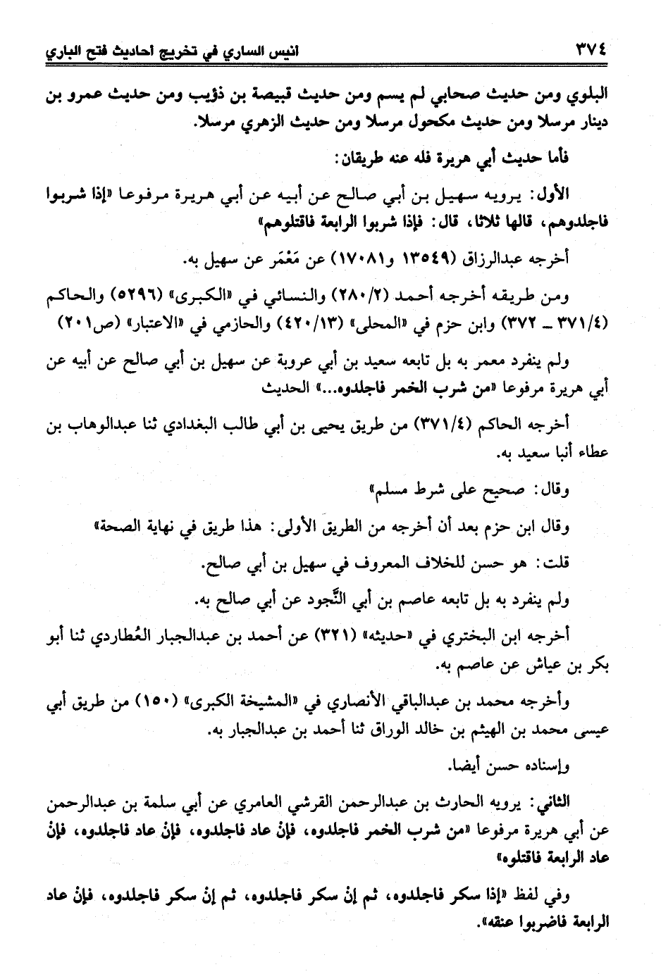 الثاني: يرويه الحارث بن عبد الرحمن القرشي العامري عن أبي سلمة بن عبد الرحمن عن أبي هريرة مرفوعاً "من شرب الخمر فاجلدوه، فإن عاد فاجلدوه، فإن عاد فاجلدوه، فإن عاد الرابعة فاقتلوه"