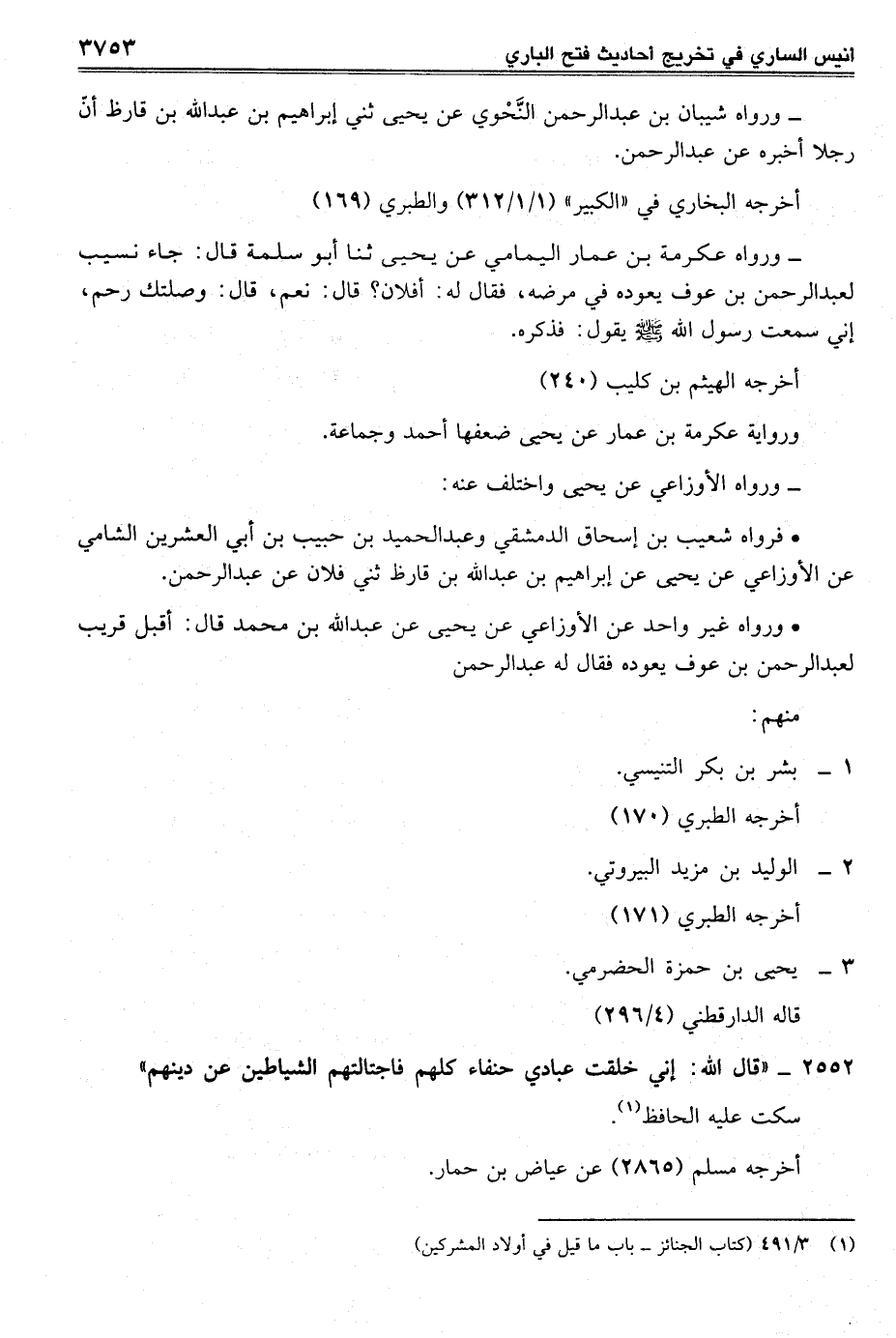 • فرواه شعيب بن إسحاق الدمشقي وعبد الحميد بن حبيب بن أبي العشرين الشامي عن الأوزاعي عن يحيى عن إبراهيم بن عبد الله بن قارظ ثني فلان عن عبد الرحمن.