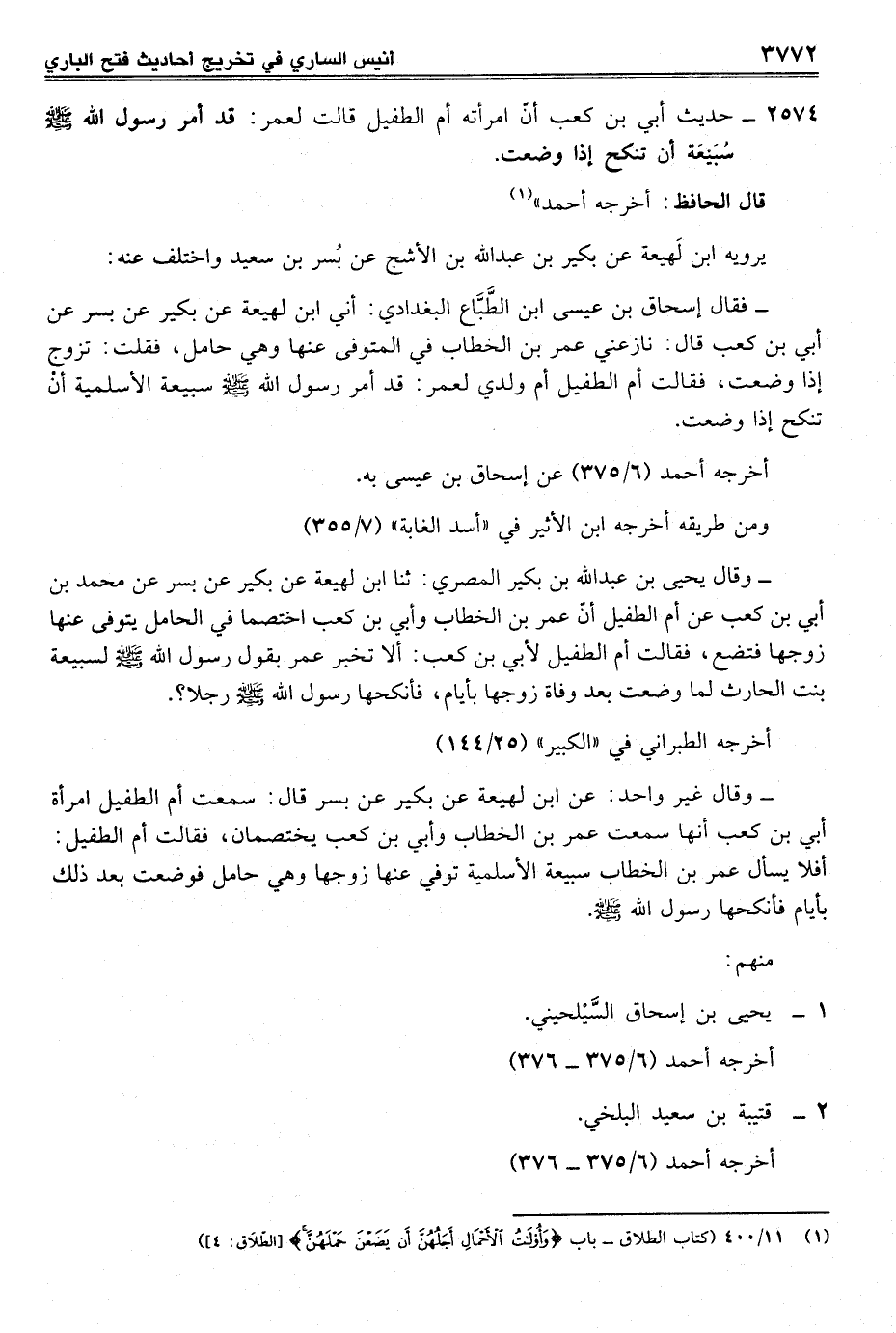 - وقال غير واحد: عن ابن لهيعة عن بكير عن بسر قال: سمعت أم الطفيل امرأة أبي بن كعب أنها سمعت عمر بن الخطاب وأبي بن كعب يختصمان، فقالت أم الطفيل: أفلا يسأل عمر بن الخطاب سبيعة الأسلمية توفي عنها زوجها وهي حامل فوضعت بعد ذلك بأيام فأنكحها رسول الله - صلى الله عليه وسلم -.