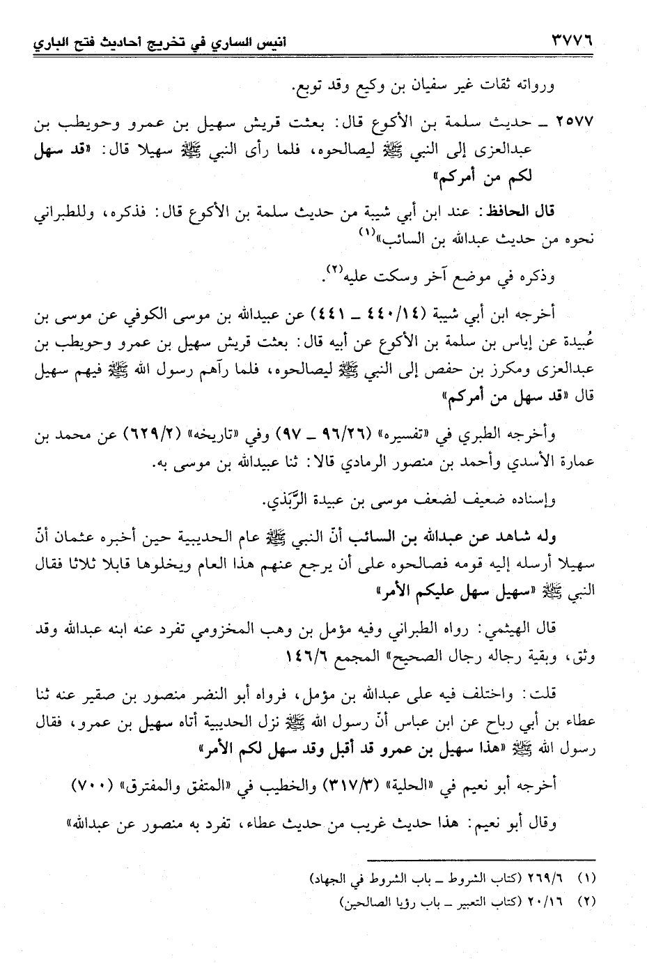 وله شاهد عن عبد الله بن السائب أن النبي - صلى الله عليه وسلم - عام الحديبية حين أخبره عثمان أنّ سهيلا أرسله إليه قومه فصالحوه على أن يرجع عنهم هذا العام ويخلوها قابلا ثلاثاً فقال النبي - صلى الله عليه وسلم - "سهيل سهل عليكم الأمر"