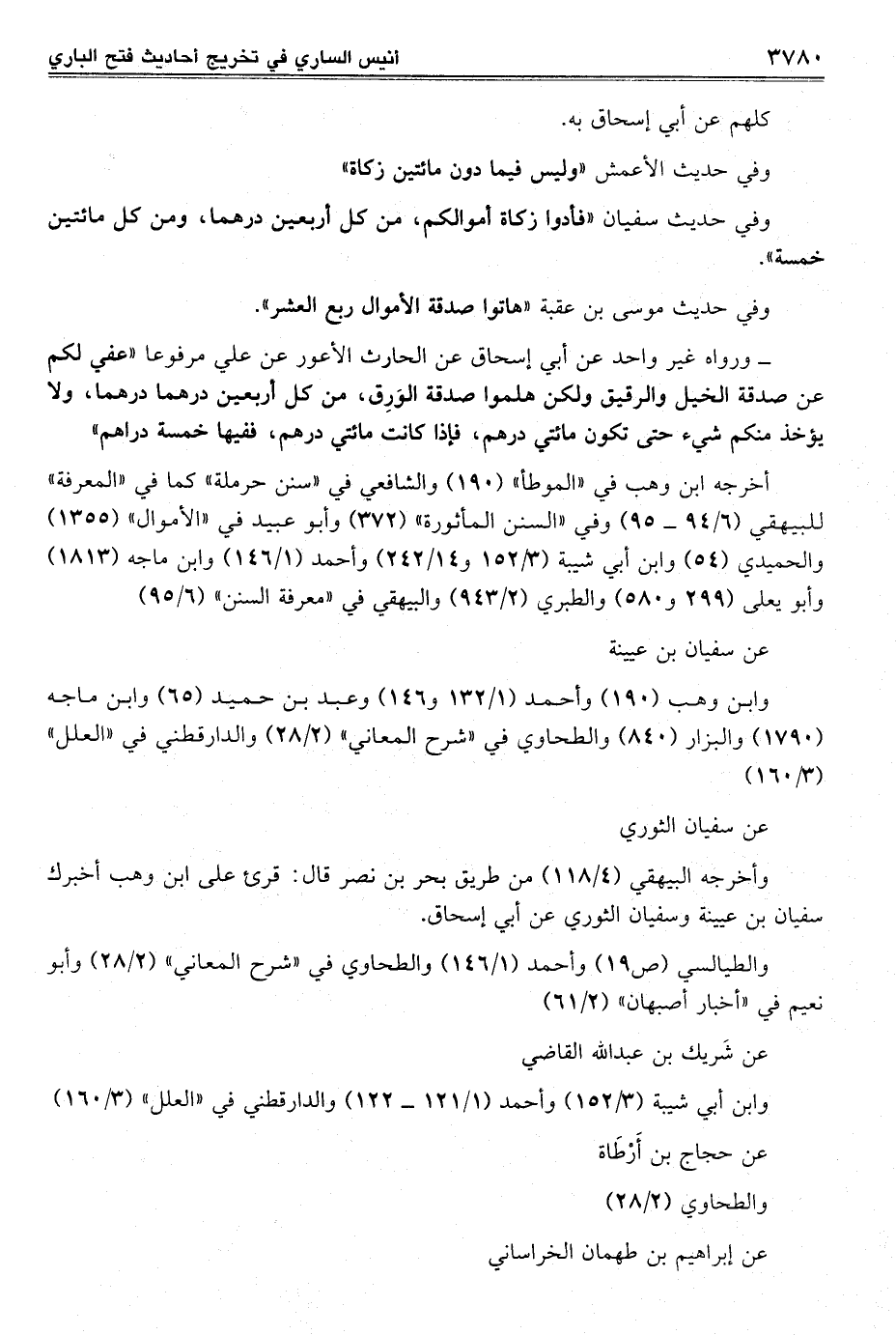 - ورواه غير واحد عن أبي إسحاق عن الحارث الأعور عن عليّ مرفوعاً "عفي لكم عن صدقة الخيل والرقيق ولكن هلموا صدقة الوَرِق، من كل أربعين درهما درهما، ولا يؤخذ منكم شيء حتى تكون مائتي درهم، فإذا كانت مائتي درهم، ففيها خمسة دراهم"