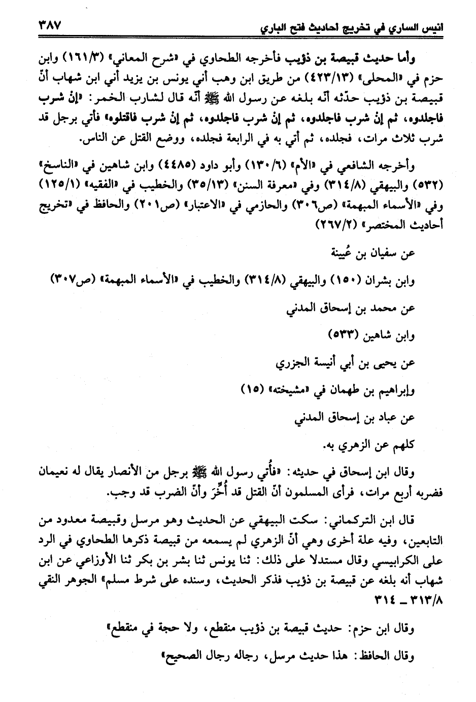 وأما حديث قبيصة بن ذؤبب فأخرجه الطحاوي في "شرح المعاني" (3/ 161) وابن حزم في "المحلى" (13/ 423) من طريق ابن وهب أني يونس بن يزيد أني ابن شهاب أن قبيصة بن ذؤيب حدّثه أنه بلغه عن رسول الله - صلى الله عليه وسلم - أنه قال لشارب الخمر: "إن شرب فاجلدوه، ثم إنْ شرب فاجلدوه، ثم إنْ شرب فاجلدوه، ثم إنْ شرب فاقتلوه" فأتي برجل قد شرب ثلاث مرات، فجلده، ثم أتى به في الرابعة فجلده، ووضع القتل عن الناس.