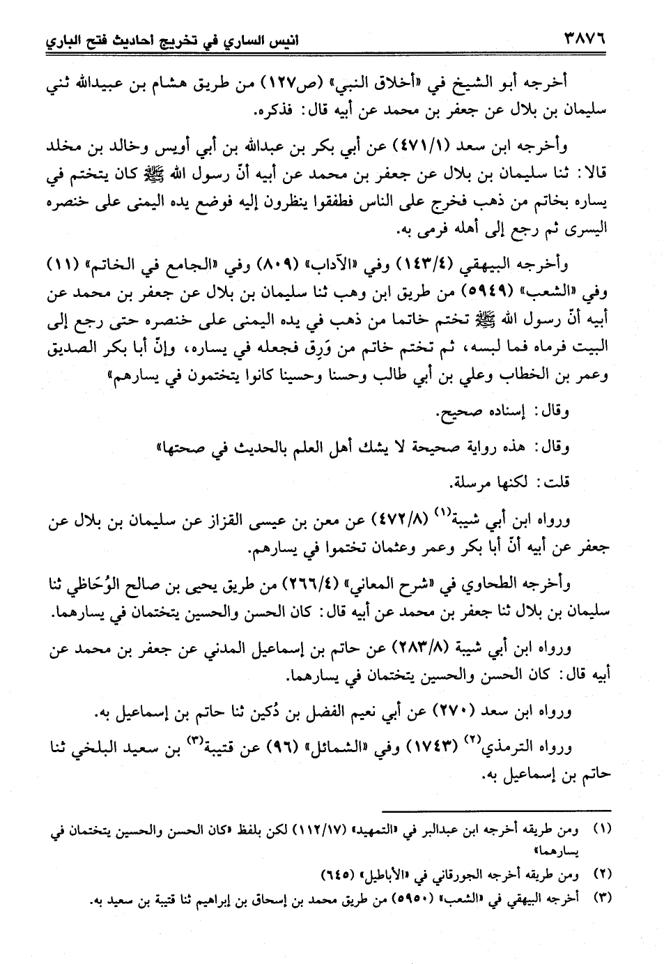 ورواه ابن أبي شيبة (¬1) (8/ 472) عن معن بن عيسى القزاز عن سليمان بن بلال عن جعفر عن أبيه أنّ أبا بكر وعمر وعثمان تختموا في يسارهم.