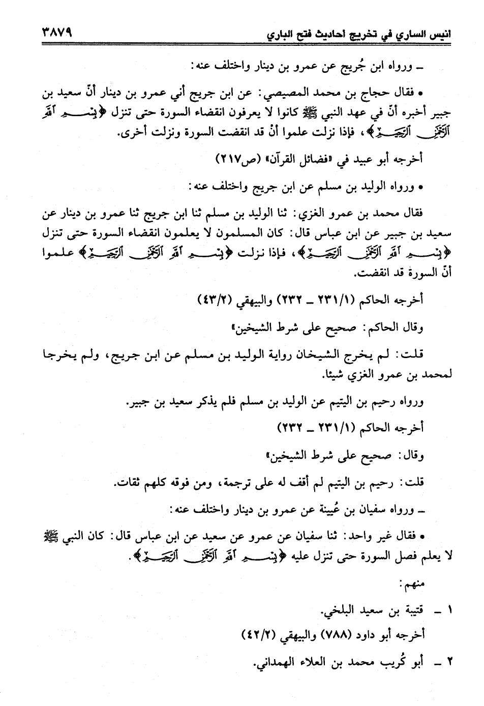 • فقال حجاج بن محمد المصيصي: عن ابن جريج أني عمرو بن دينار أنّ سعيد بن جبير أخبره أنّ في عهد النبي - صلى الله عليه وسلم - كانوا لا يعرفون انقضاء السورة حتى تنزل {بِسْمِ اللَّهِ الرَّحْمَنِ الرَّحِيمِ}، فإذا نزلت علموا أنْ قد انقضت السورة ونزلت أخرى.