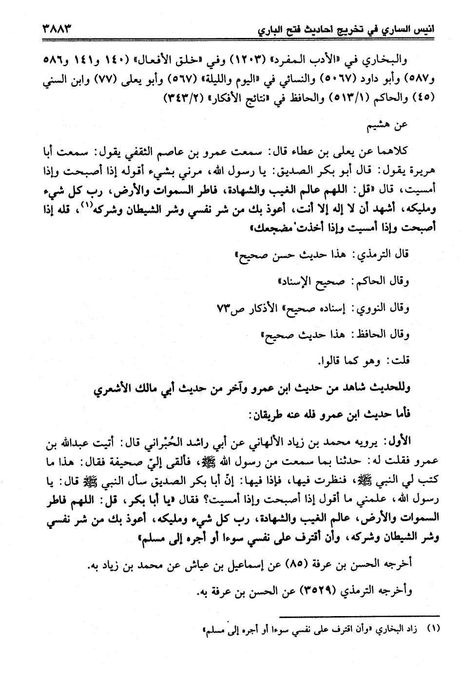 الأول: يرويه محمد بن زياد الألهاني عن أبي راشد الحُبْراني قال: أتيت عبد الله بن عمرو فقلت له: حدثنا بما سمعت من رسول الله - صلى الله عليه وسلم -، فألقى إليّ صحيفة فقال: هذا ما كتب لي النبي - صلى الله عليه وسلم -، فنظرت فيها، فإذا فيها: إنّ أبا بكر الصديق سأل النبي - صلى الله عليه وسلم - قال: يا رسول الله، علمني ما أقول إذا أصبحت وإذا أمسيت؟ فقال "يا أبا بكر، قل: اللهم فاطر السماوات والأرض، عالم الغيب والشهادة، رب كل شيء ومليكه، أعوذ بك من شر نفسي وشر الشيطان وشركه، وأن أقترف على نفسي سوءا أو أجره إلى مسلم"