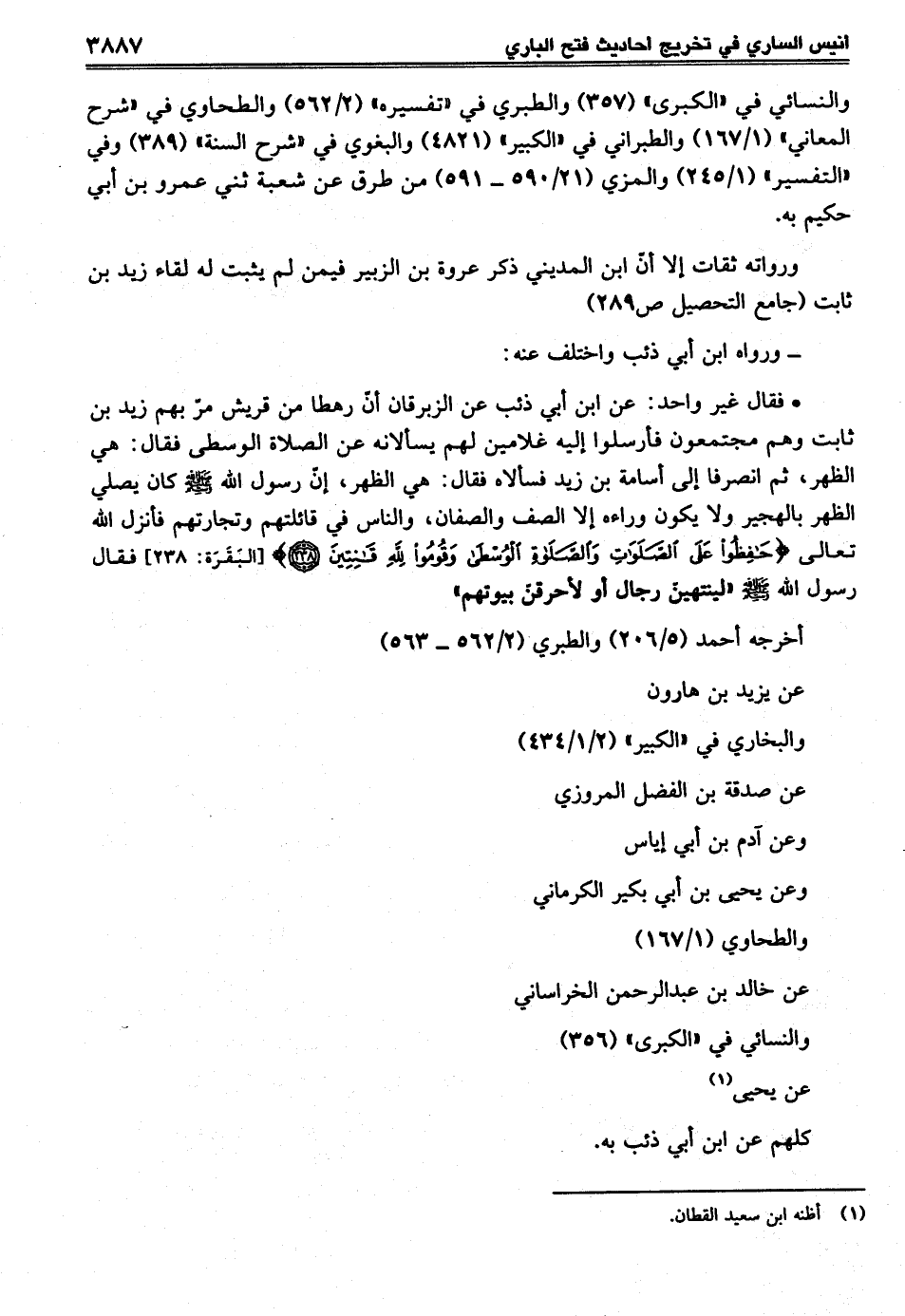 • فقال غير واحد: عن ابن أبي ذئب عن الزبرقان أنّ رهطا من قريش مرّ بهم زيد بن ثابت وهم مجتمعون فأرسلوا إليه غلامين لهم يسألانه عن الصلاة الوسطى فقال: هي الظهر، ثم انصرفا إلى أسامة بن زيد فسألاه فقال: هي الظهر، إنّ رسول الله صلى الله عليه وسلم كان يصلي الظهر بالهجير ولا يكون وراءه إلا الصف والصفان، والناس في قائلتهم وتجارتهم فأنزل الله تعالى {حَافِظُوا عَلَى الصَّلَوَاتِ وَالصَّلَاةِ الْوُسْطَى وَقُومُوا لِلَّهِ قَانِتِينَ (238)} [البقرة: 238] فقال رسول الله - صلى الله عليه وسلم - "لينتهينّ رجال أو لأحرقنّ بيوتهم"
