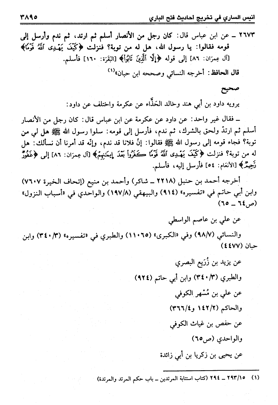 2673 - عن ابن عباس قال: كان رجل من الأنصار أسلم ثم ارتد، ثم ندم وأرسل إلى قومه فقالوا: يا رسول الله، هل له من توبة؟ فنزلت {كَيْفَ يَهْدِي اللَّهُ قَوْمًا} [آل عمران: 86] إلى قوله {إِلَّا الَّذِينَ تَابُوا} [آل عمران: 89] فأسلم.
